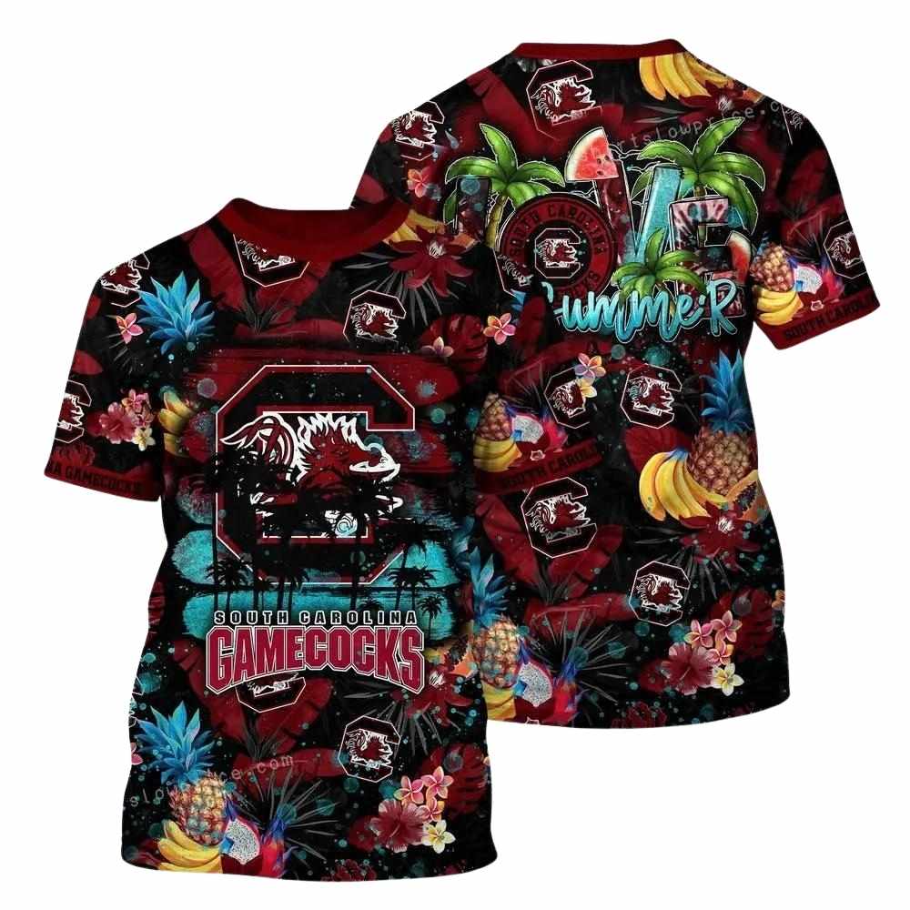 Embrace the vibrant spirit of summer with our South Carolina Gamecocks Fruit Beach Summer Tropical AOP T-Shirt! Perfect for fans and fashionistas alike, this shirt is designed for casual outings, beach days, or just chilling with friends. Its unique all-over print captures the essence of tropical fun while showcasing your team spirit in style.
