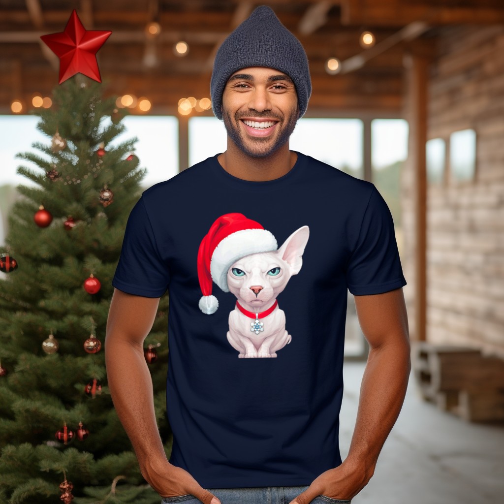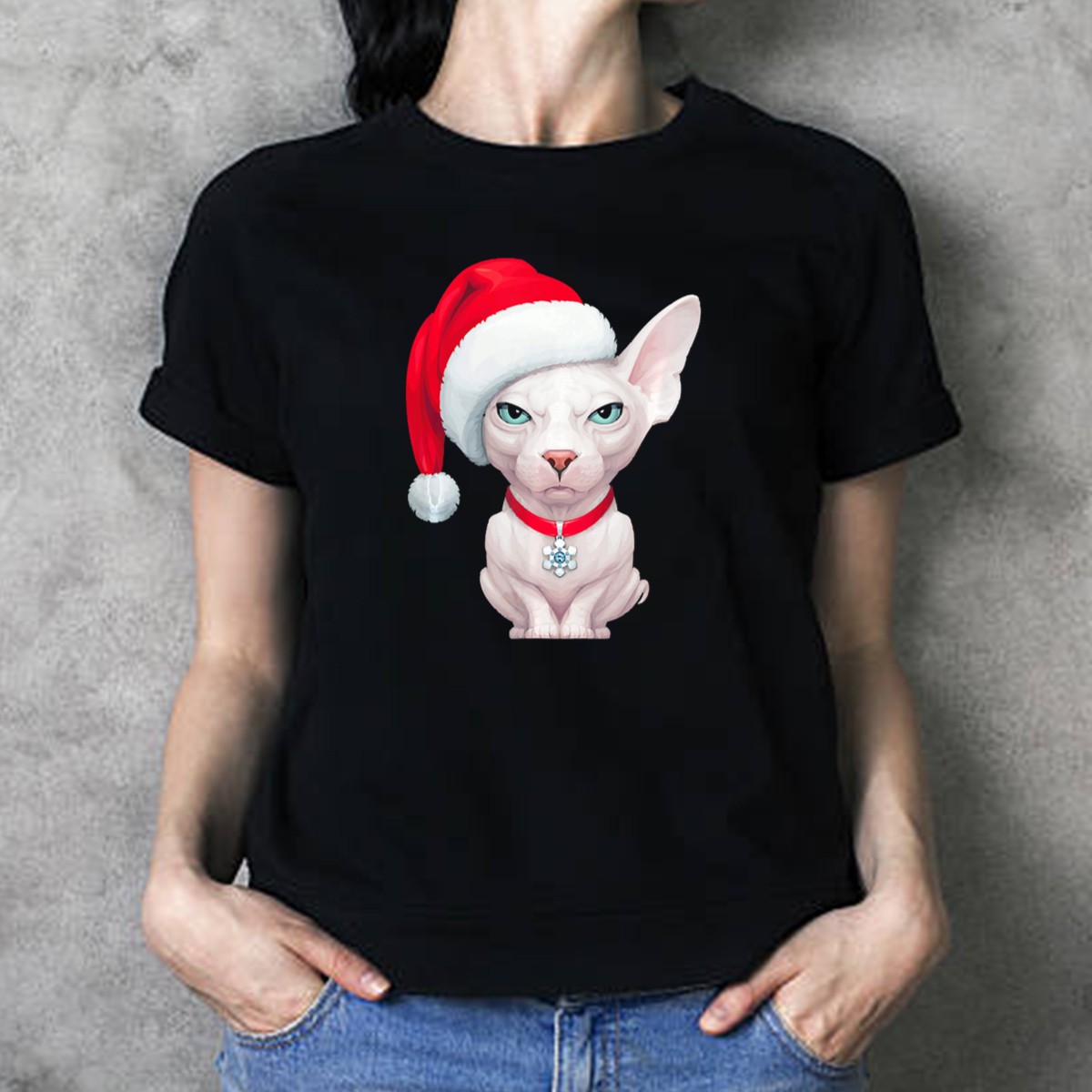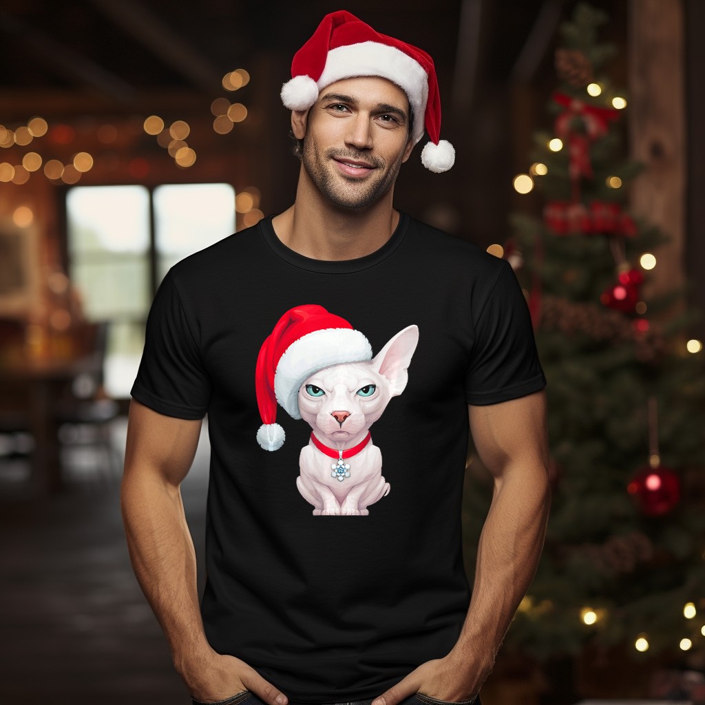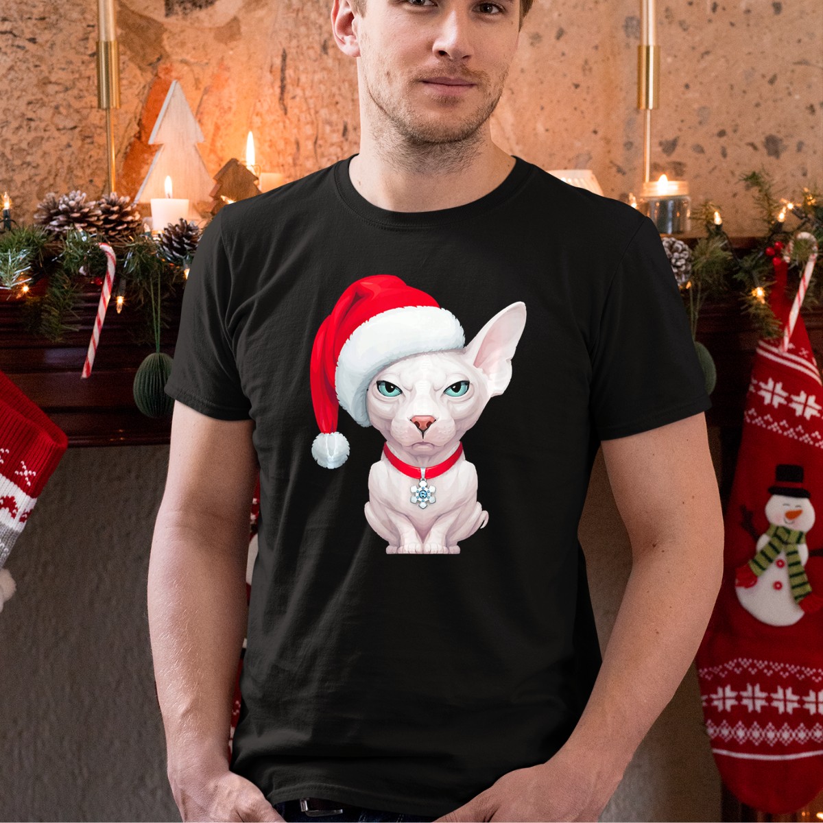 Celebrate the festive season with our Sphynx Cat Santa Hat Christmas Holiday Festive Pet Charm T-Shirt! Perfect for cat lovers and holiday enthusiasts alike, this whimsical tee showcases a playful design that’s sure to bring a smile to everyone around. Made for casual wear, themed events, or simply lounging at home during the holidays, this shirt is a delightful addition to your wardrobe that expresses your love for both pets and the festive spirit. With its fan-made design printed right here in the USA, it’s a unique piece that stands out during the holiday season.
