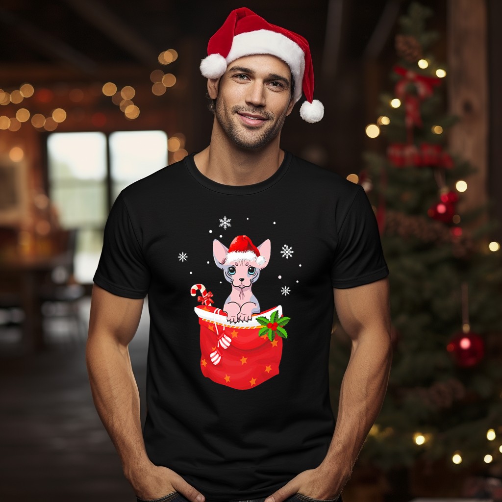 Celebrate the holiday season with our charming Sphynx Cat Wearing Santa Hat In Christmas Stocking With Candy Cane And Snowflakes T-Shirt! Perfect for cat lovers and holiday enthusiasts alike, this playful design adds a whimsical touch to your casual wear. Ideal for themed events, parties, or simply spreading festive cheer during daily activities, this shirt showcases a fan-made graphic that captures the essence of Christmas spirit. Printed in the USA, it’s not just a T-shirt; it’s a fun expression of your love for pets and the holidays!