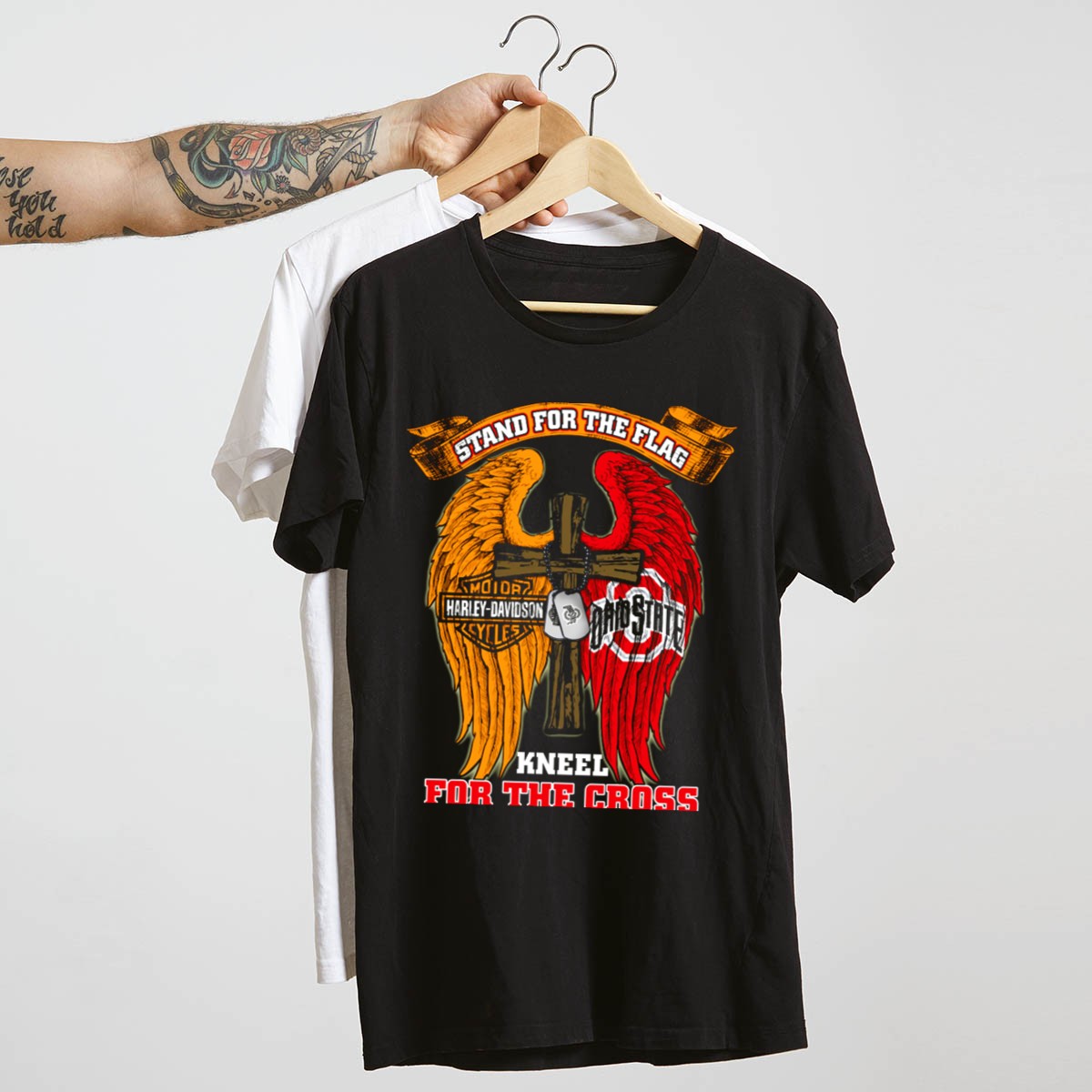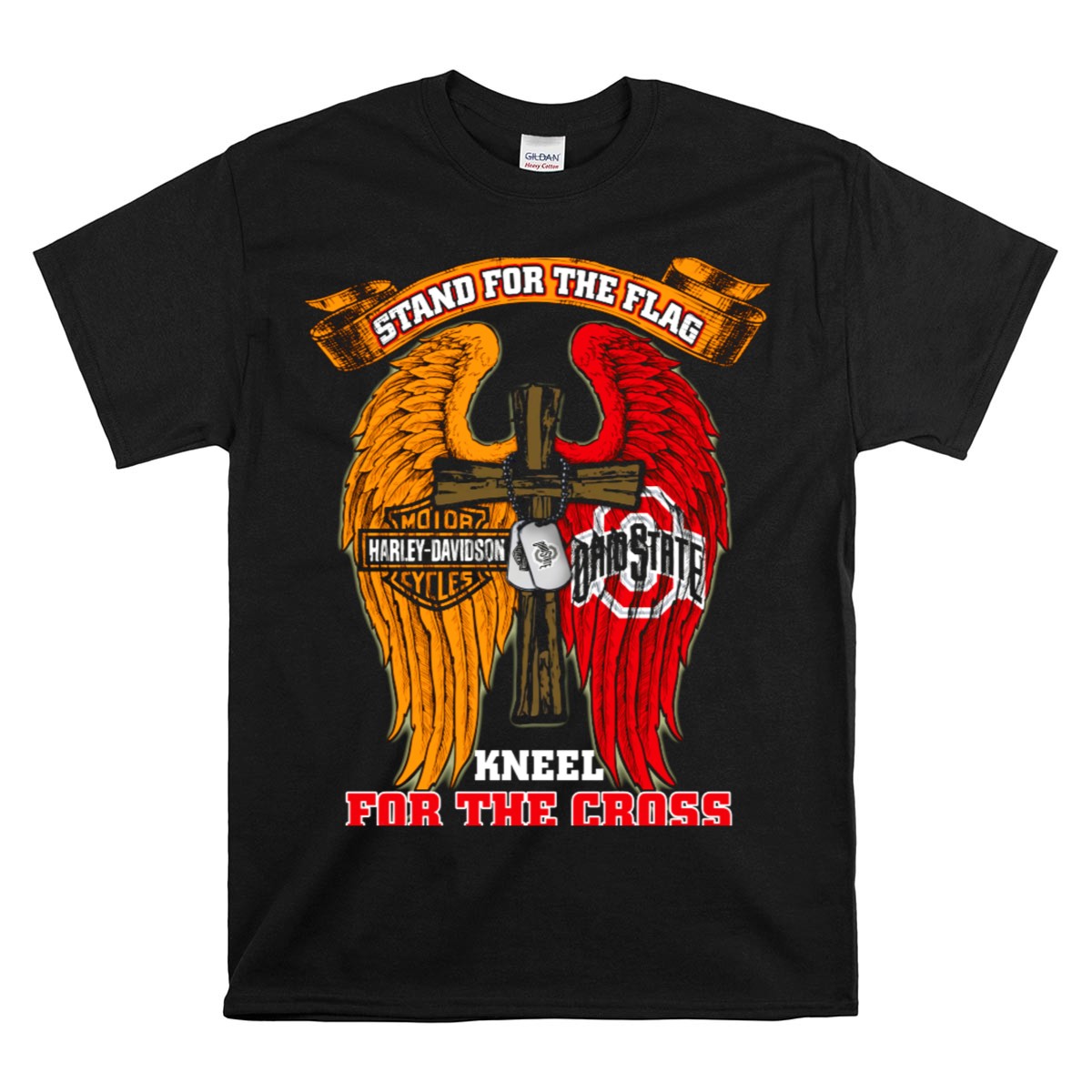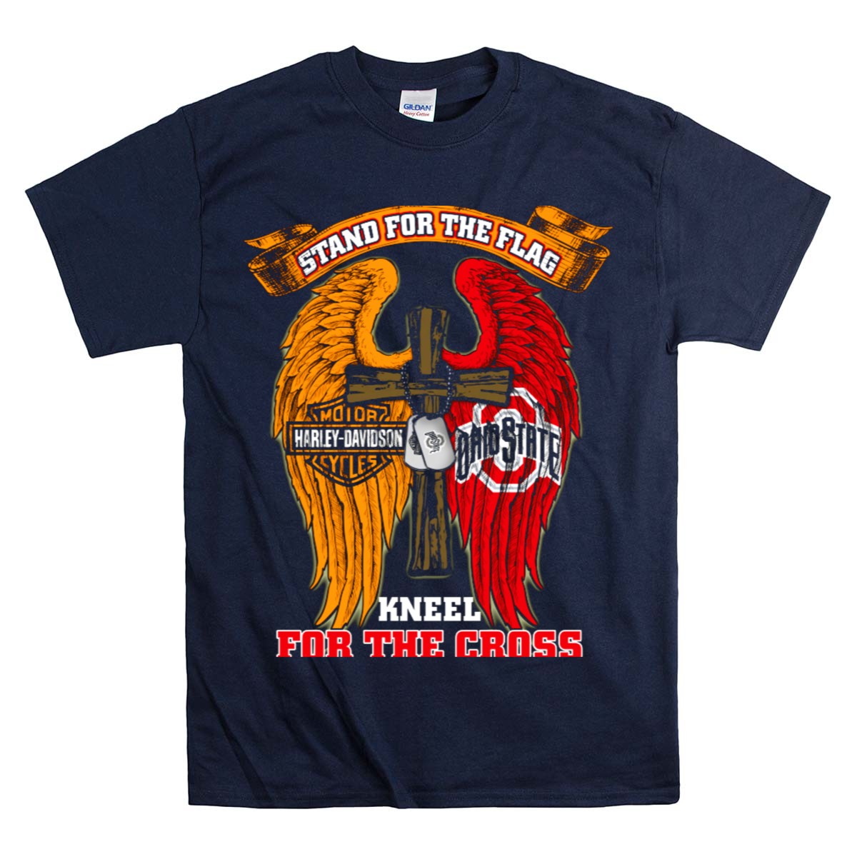 Show your unwavering support for both faith and freedom with our “Stand For The Flag Kneel For The Cross” Harley Davidson Ohio State Buckeyes T-Shirt. Perfect for passionate fans and proud patriots alike, this shirt is an ideal choice for casual outings, themed events, or daily wear. Crafted with a unique fan-made design and printed right here in the USA, it stands out as a symbol of your commitment to both your team and your values.