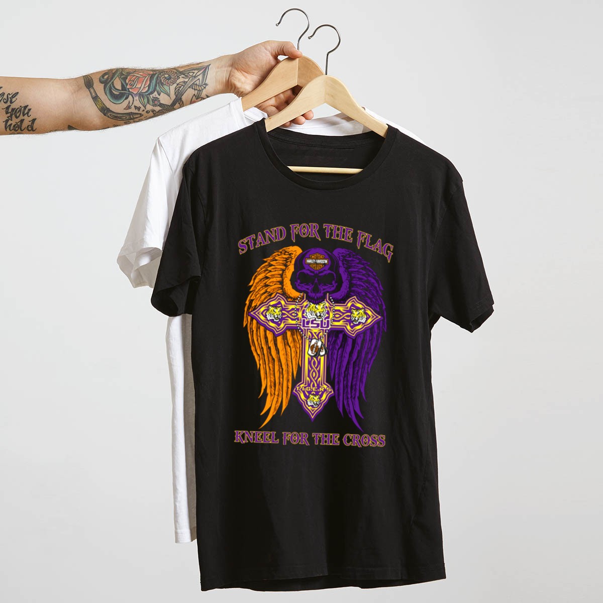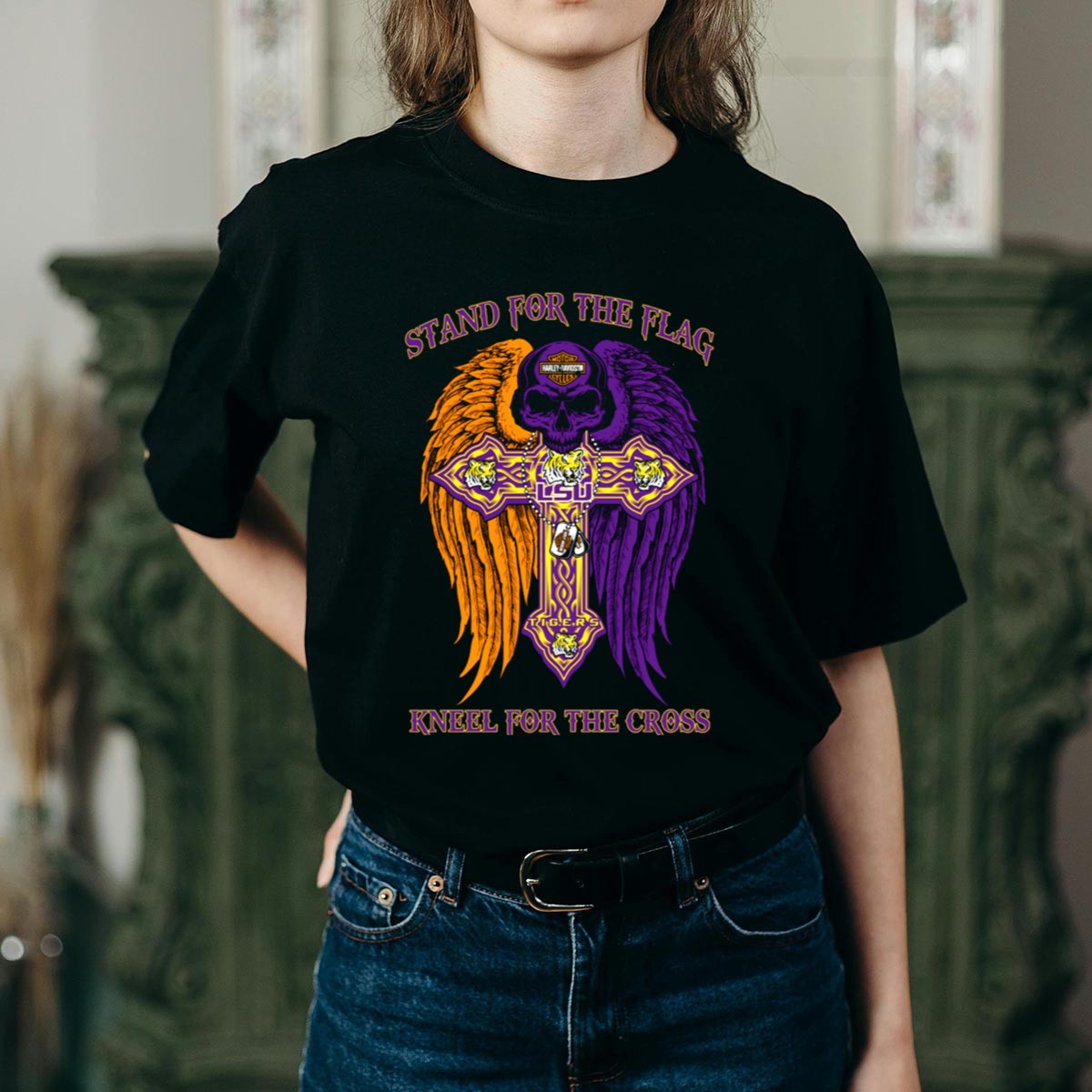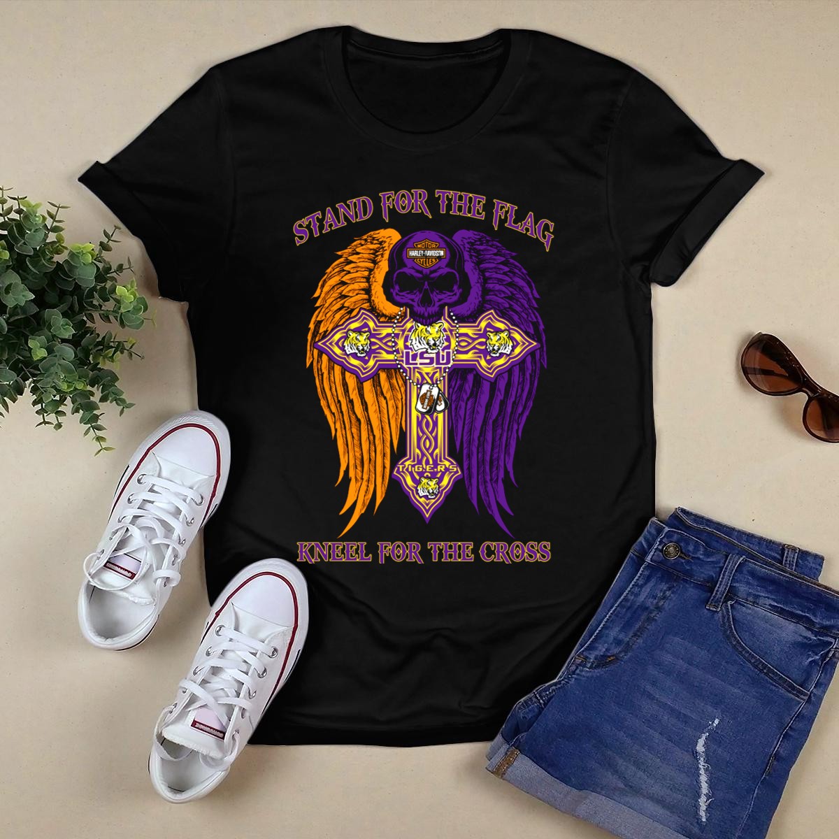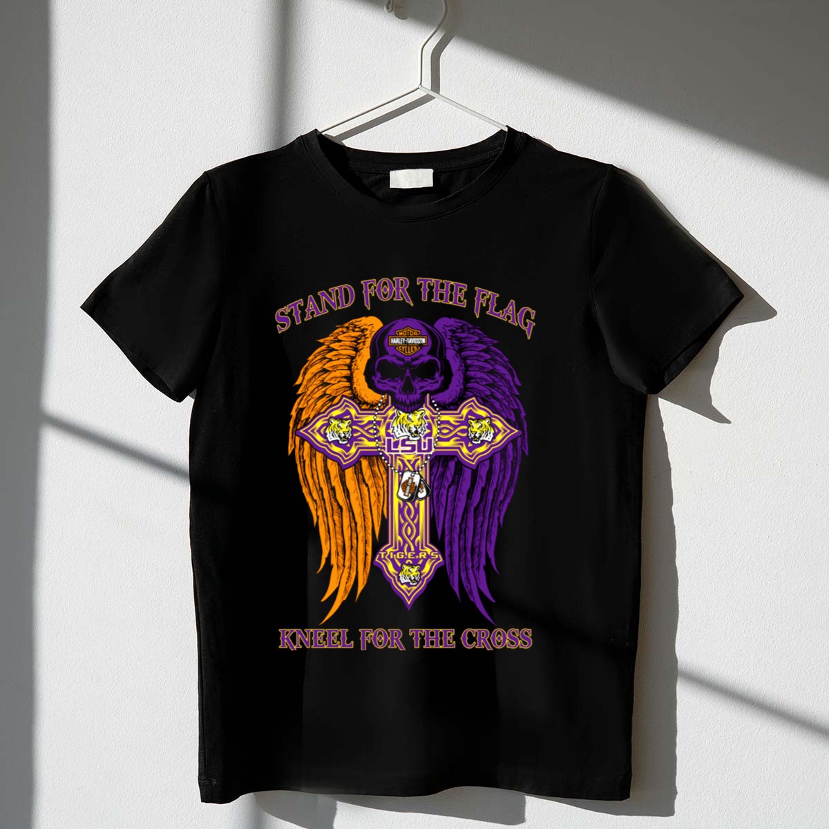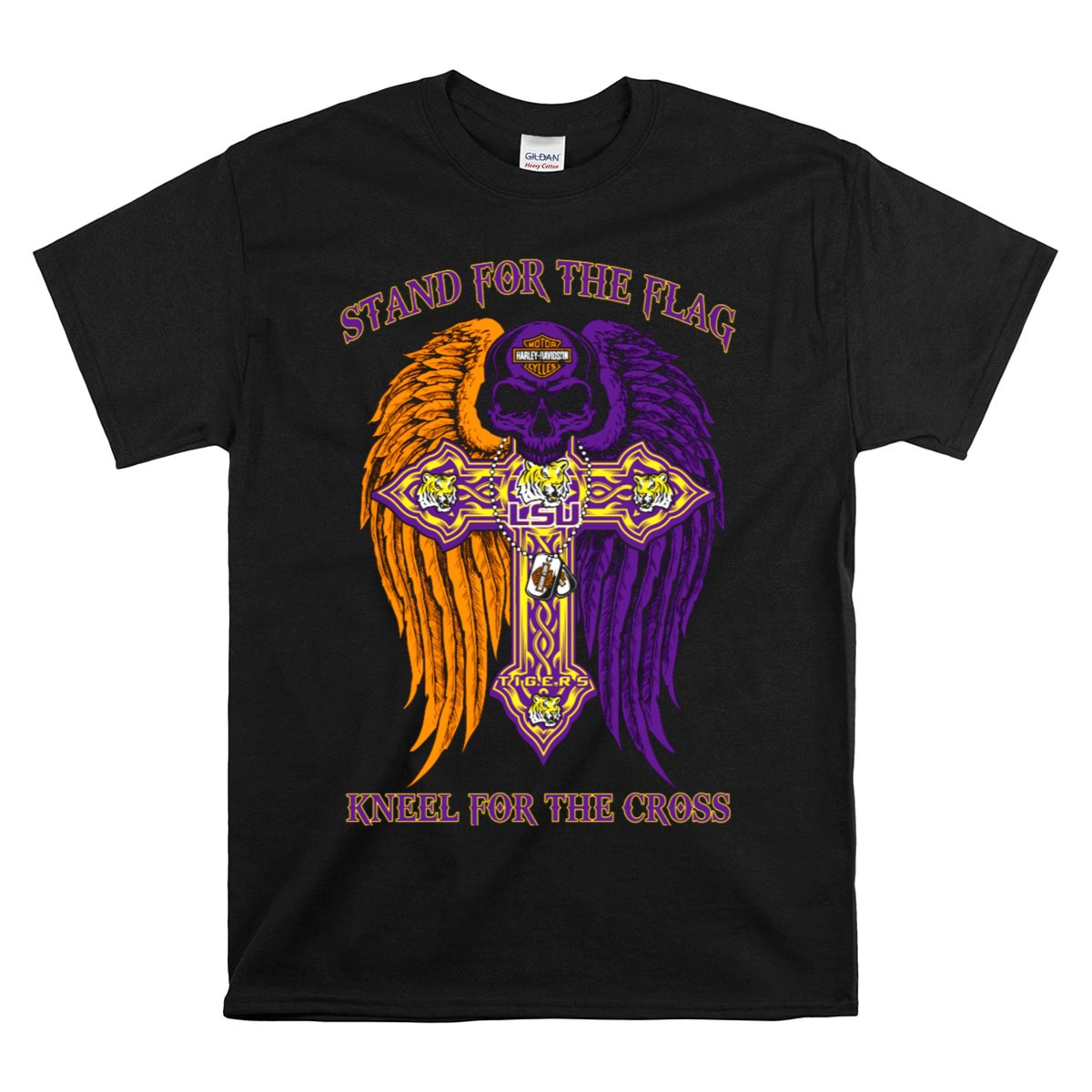 Show your unwavering support for the LSU Tigers with this “Stand For The Flag Kneel For The Cross” T-shirt. Perfect for passionate fans, this shirt celebrates your team spirit while conveying a powerful message. Ideal for casual outings, themed events, or daily wear, this fan-made design is printed in the USA, ensuring both quality and a unique expression of your loyalty.