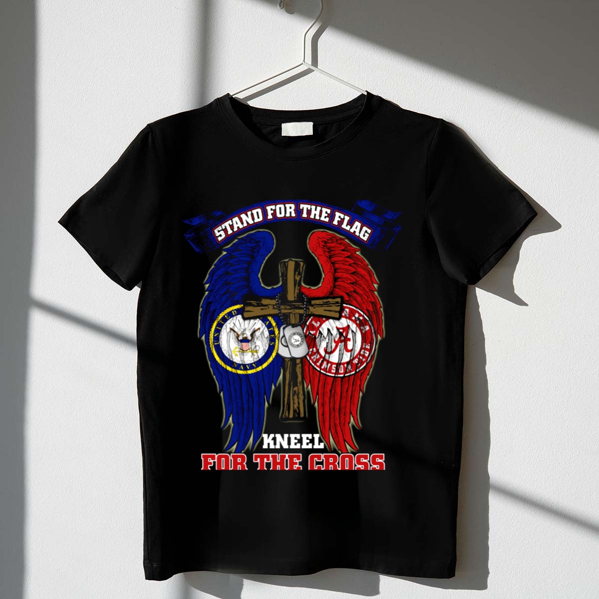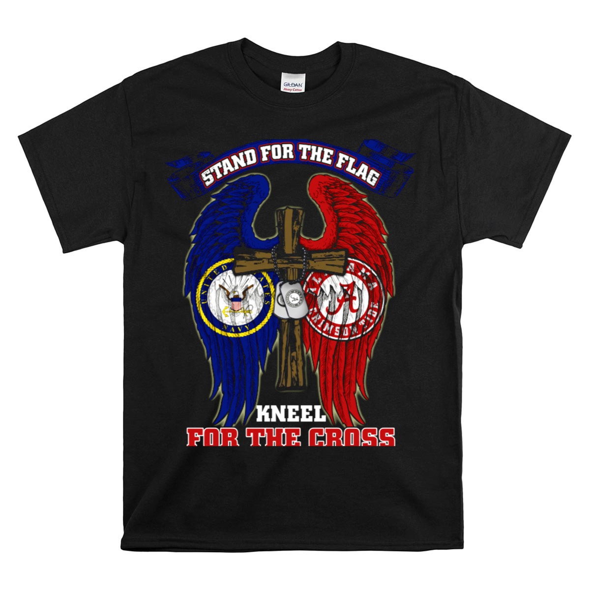 Show your unwavering support for the Navy and your love for the Crimson Tide with our “Stand For The Flag Kneel For The Cross” T-shirt. This fan-made design is perfect for proud supporters, whether you’re cheering on your team at a game, attending casual gatherings, or just going about your daily activities. Made in the USA, this shirt combines style and comfort, making it an essential addition to your wardrobe.
