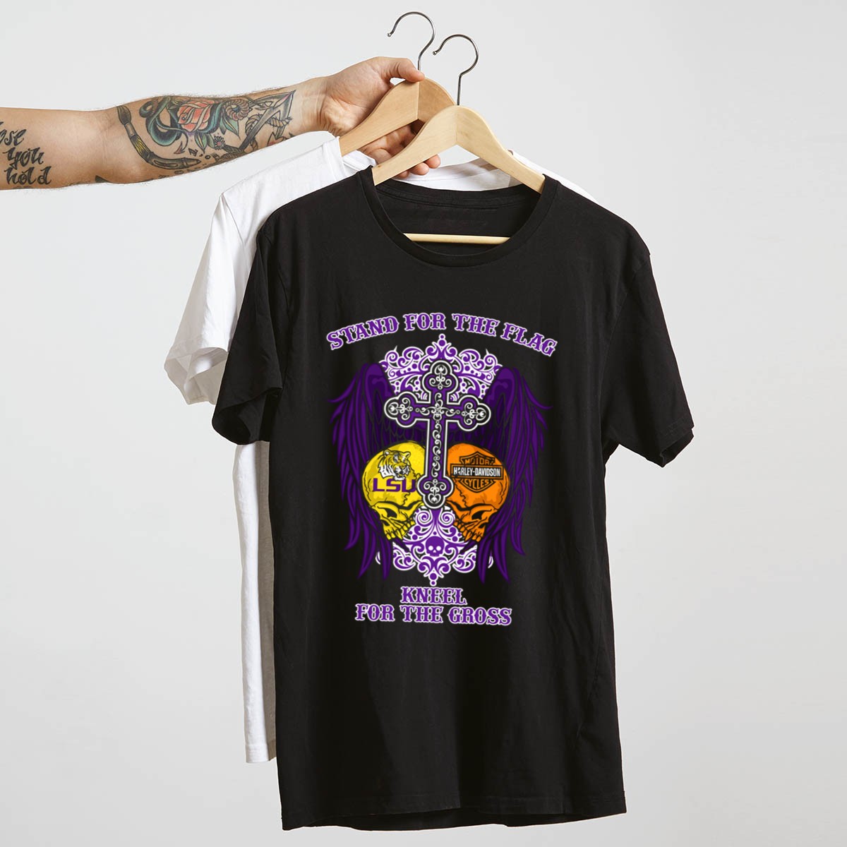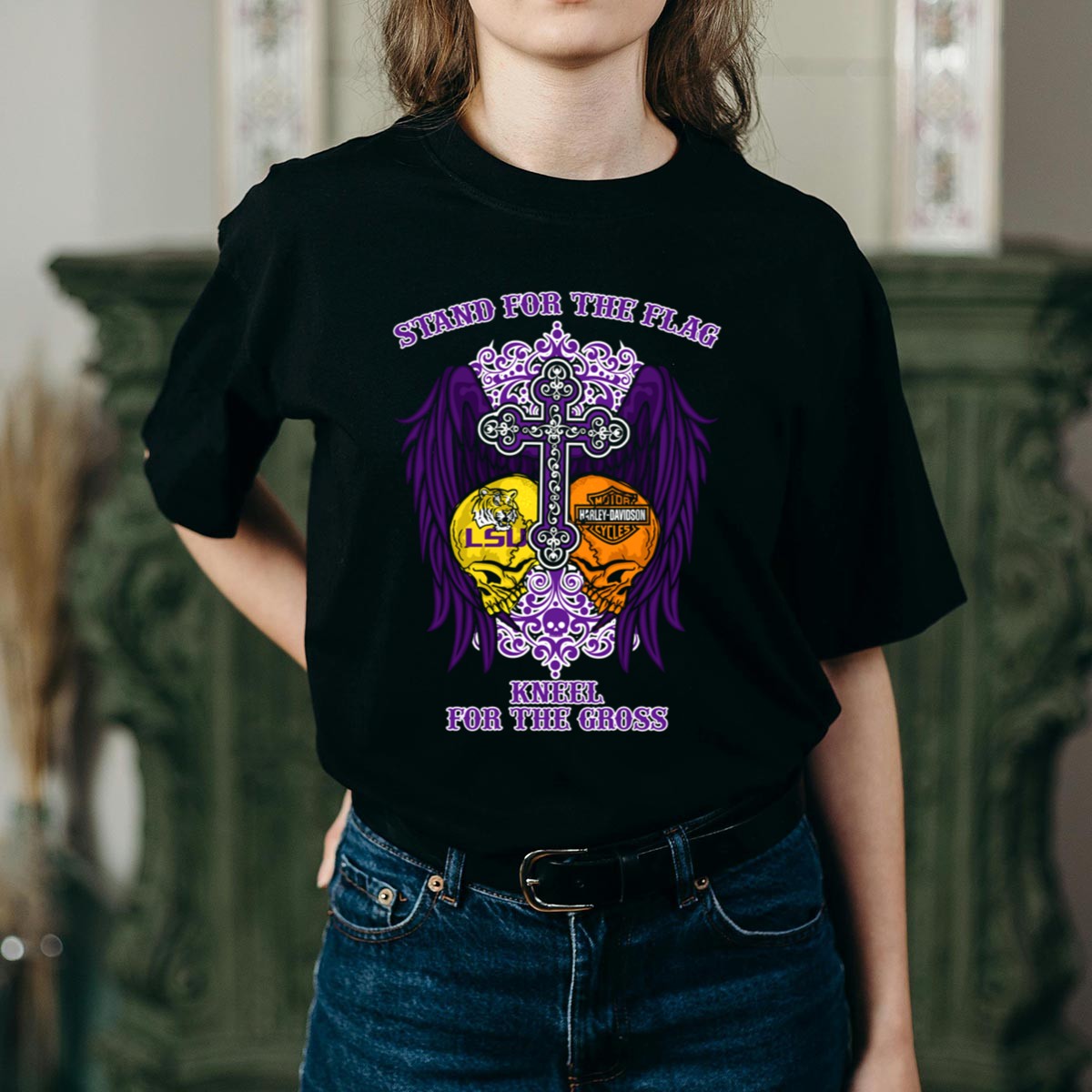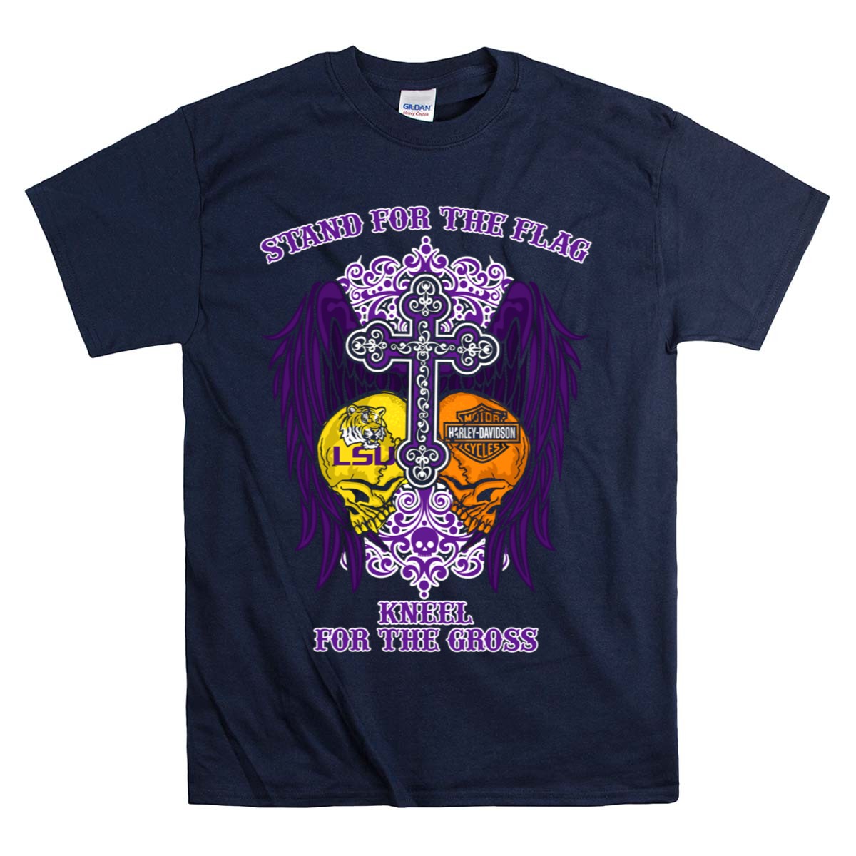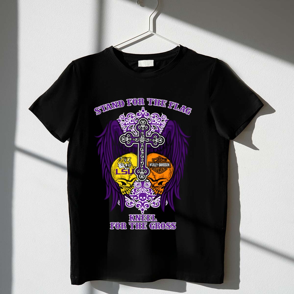 Show your unwavering spirit and pride with our Stand For The Flag LSU Tigers HD Wings Kneel For The Cross T-Shirt. This fan-made design is perfect for true LSU Tigers supporters who want to express their love for both their team and their values. Ideal for casual outings, themed events, or just daily wear, this shirt combines comfort with a powerful message, making it a standout piece in any wardrobe.