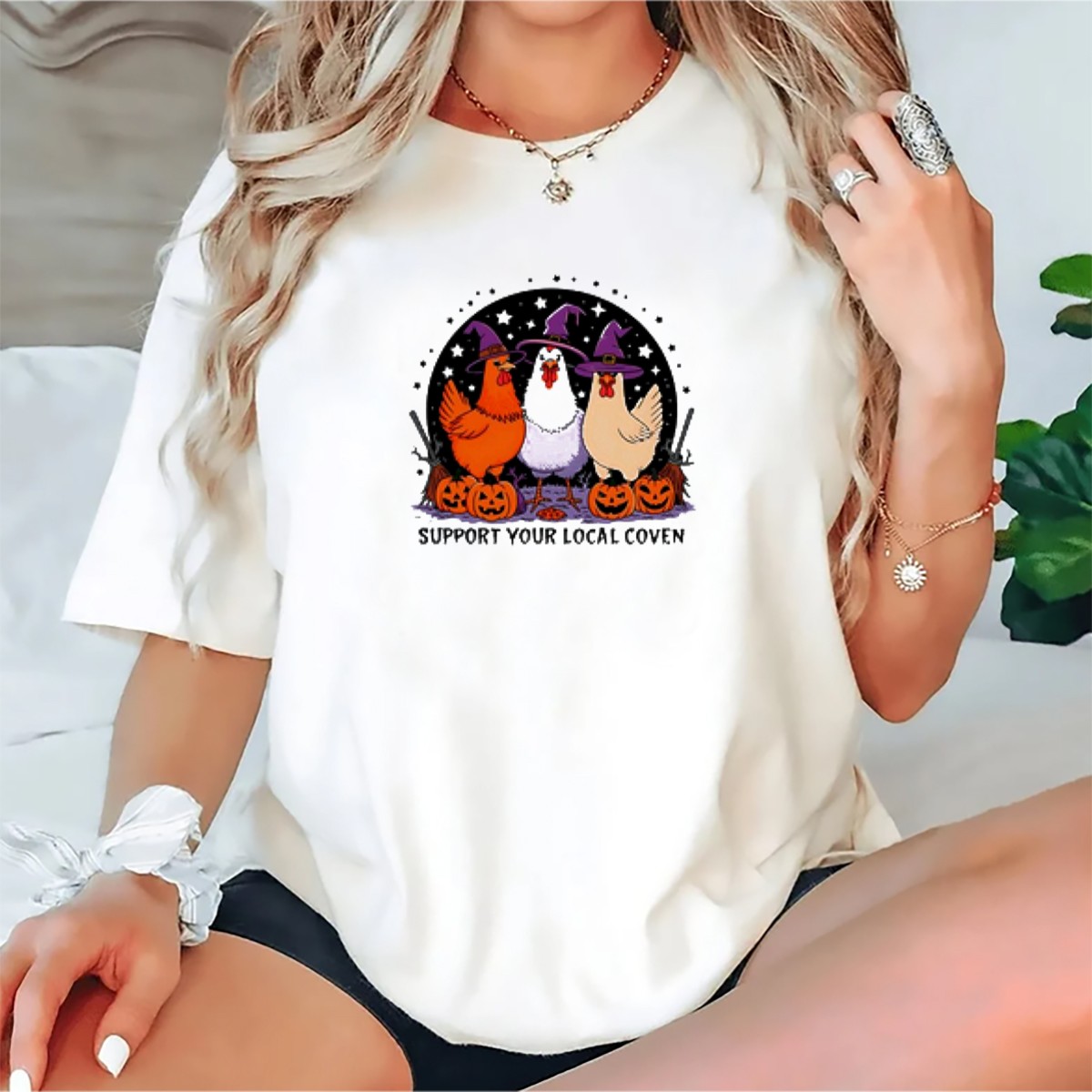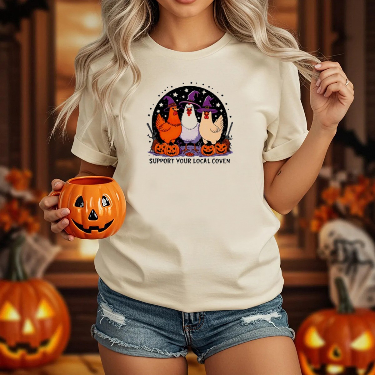 Celebrate the spirit of Halloween with our Support Your Local Coven T-Shirt, featuring an enchanting cartoon trio of chickens donning witch hats and surrounded by playful pumpkins. Perfect for those who embrace the whimsical side of the season, this shirt is ideal for casual wear, themed events, or daily outings. Crafted for comfort and style, it showcases a fan-made design proudly printed in the USA, making it a unique addition to your festive wardrobe.