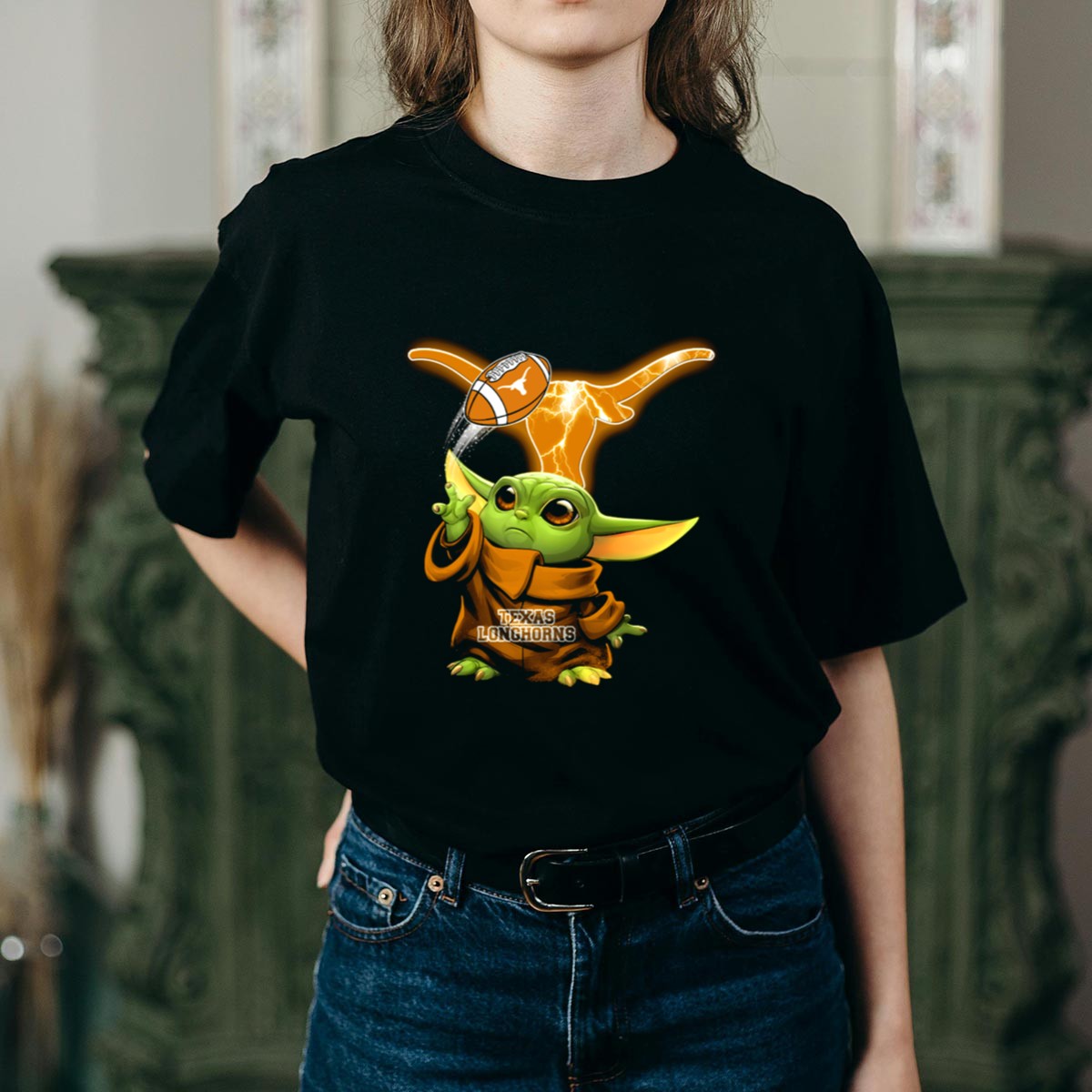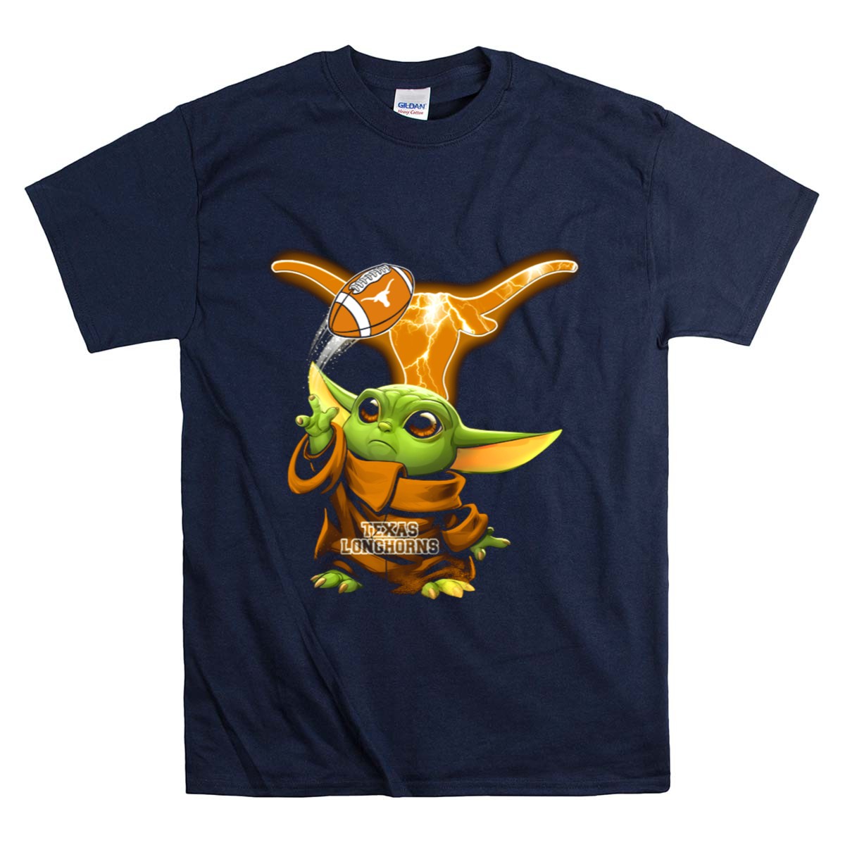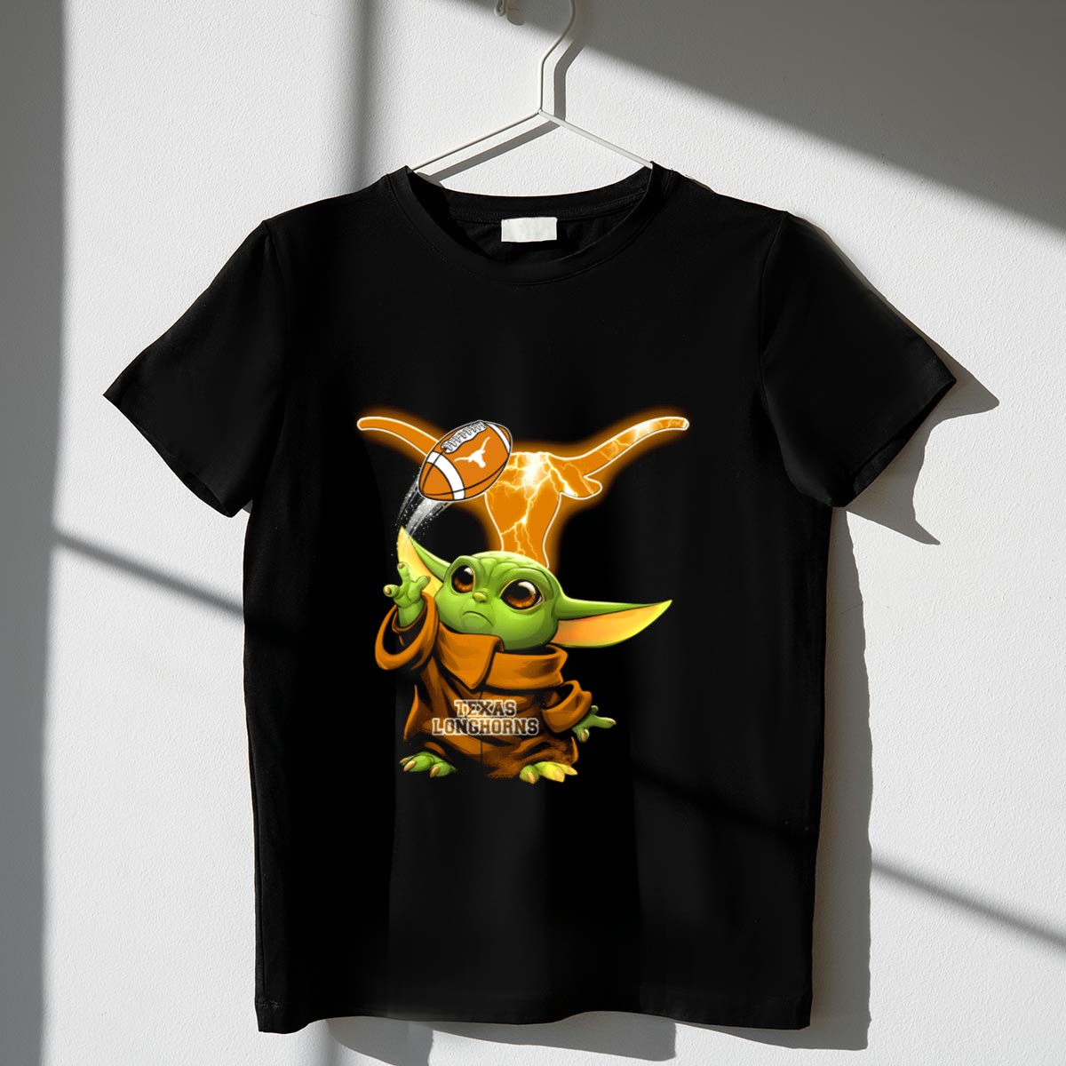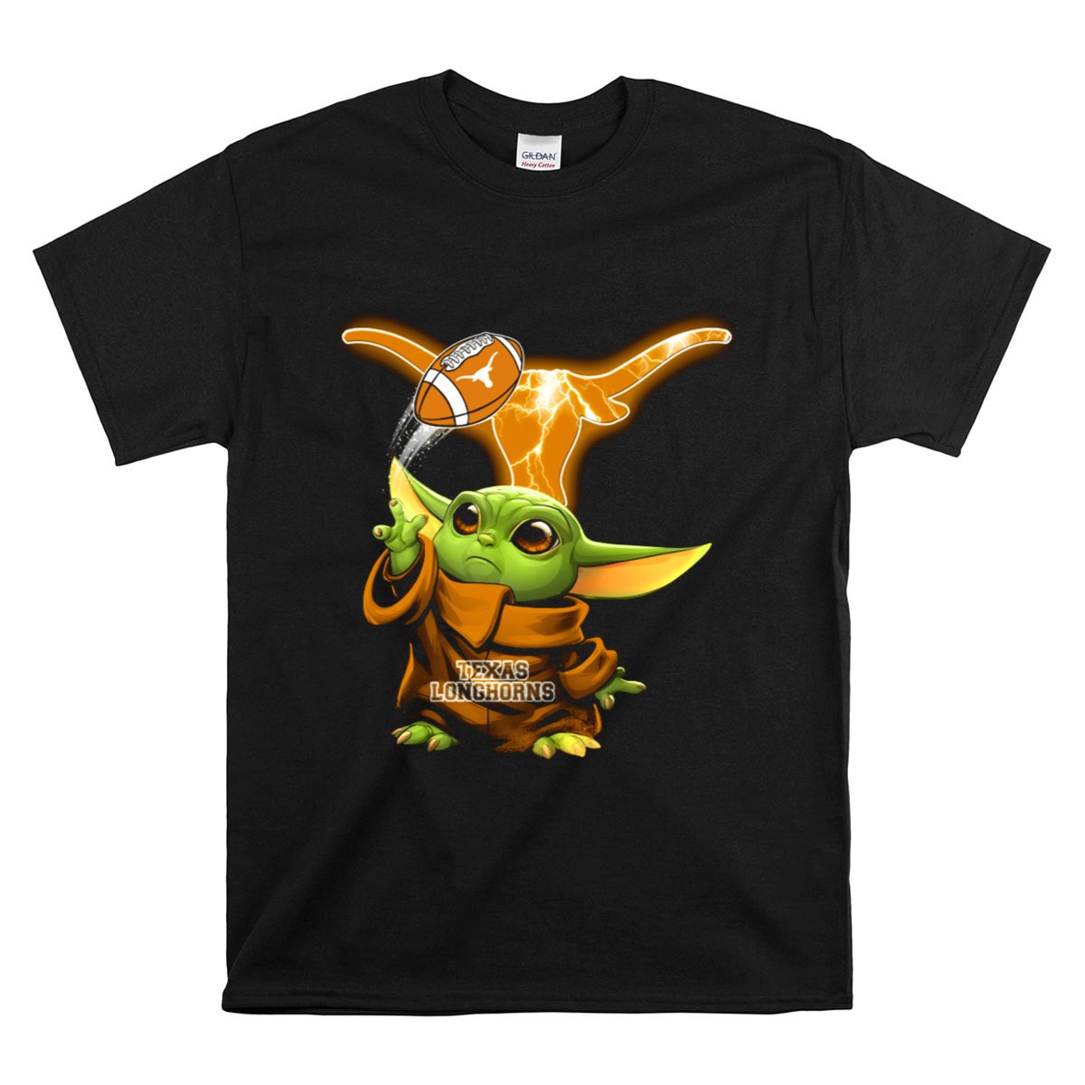 Show off your love for the Texas Longhorns and the adorable Baby Yoda with this unique football-themed T-shirt! Perfect for fans of all ages, this shirt combines your passion for college football with a touch of whimsy. Ideal for casual wear, themed events, or just lounging around, this fan-made design printed in the USA is sure to make a statement and bring smiles wherever you go.