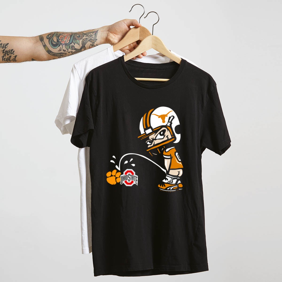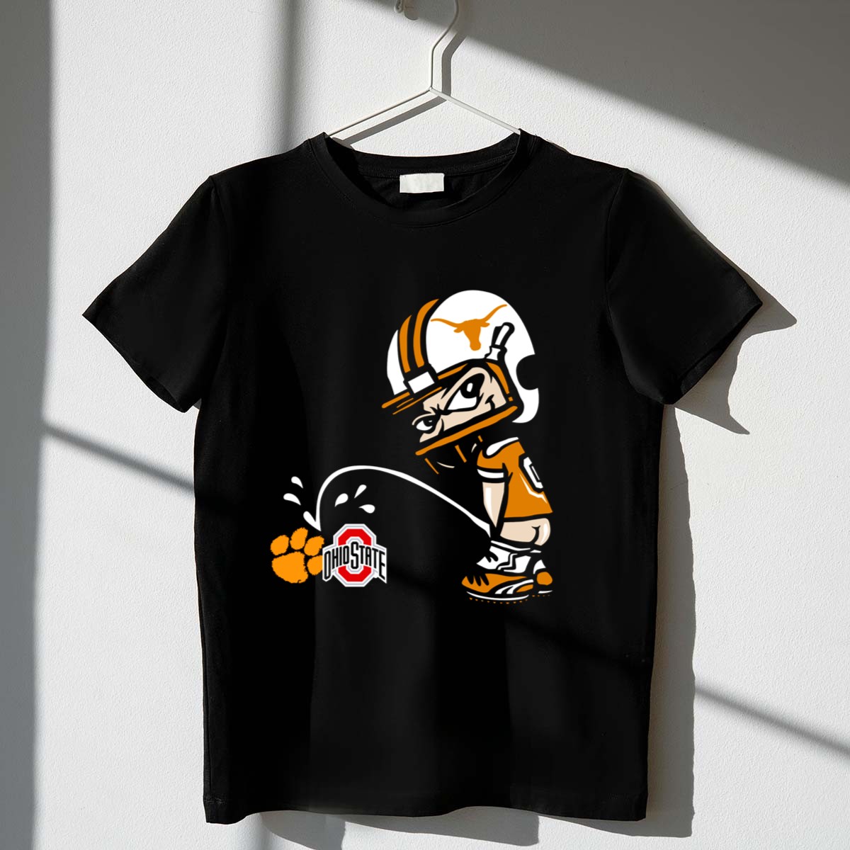 Show off your team spirit with our Texas Longhorns Mascot Football Rivalry Cartoon Ohio State Logo T-Shirt! This fan-made design captures the excitement of college football, making it the perfect choice for die-hard fans and casual wearers alike. Whether you’re heading to a game, gathering with friends, or just enjoying a laid-back day, this shirt is sure to turn heads and spark conversations. Made with love in the USA, it’s a unique piece that celebrates the rivalry in style.