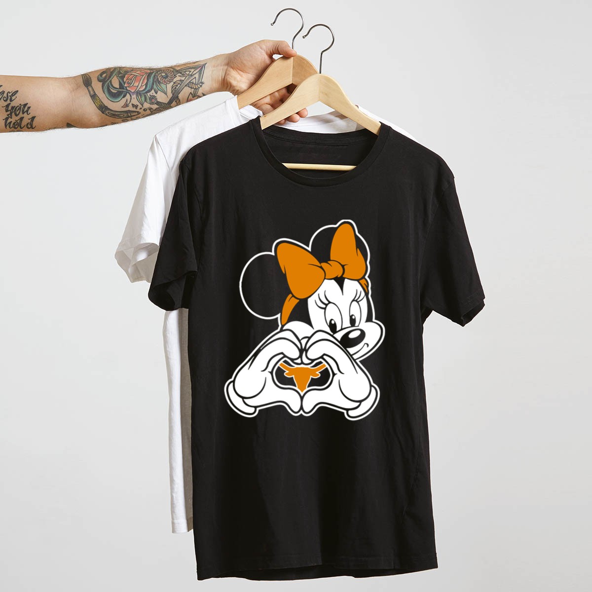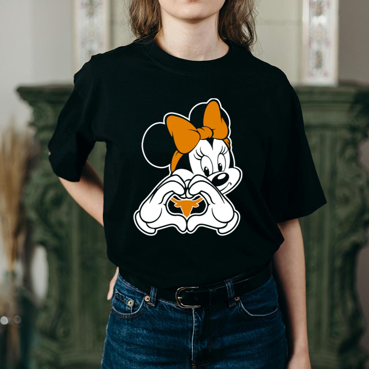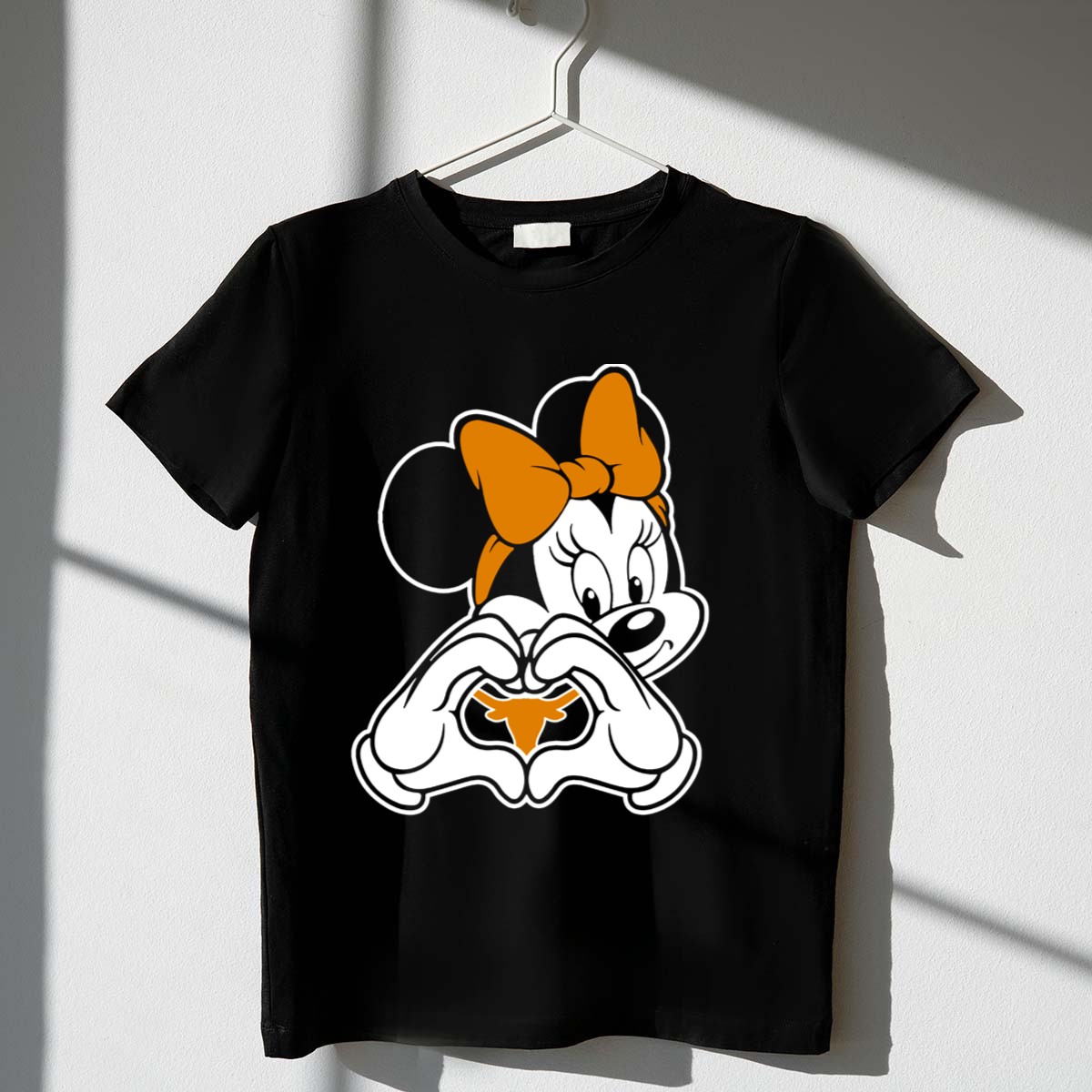 Show off your Texas spirit with this adorable Texas Longhorns Minnie Mouse Heart Hands T-Shirt! Perfect for fans of all ages, this shirt combines the beloved Disney character with the iconic Longhorns logo, making it a standout piece for game days, themed events, or casual outings. Crafted from high-quality materials and printed right here in the USA, this fan-made design is a unique way to express your love for both Texas and Disney.
