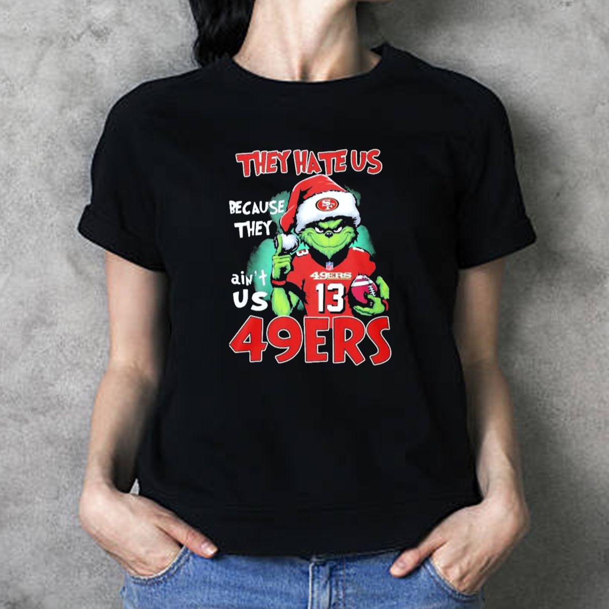 Show off your team spirit with our “The Grinch They Hate Us Because They Aint Us” San Francisco 49ers Christmas Football T-Shirt! Perfect for die-hard fans, this shirt is ideal for casual outings, themed events, or daily wear during the festive season. Made with a unique fan-made design, this shirt is not only stylish but also a great conversation starter, showcasing your love for the 49ers in a fun and festive way!