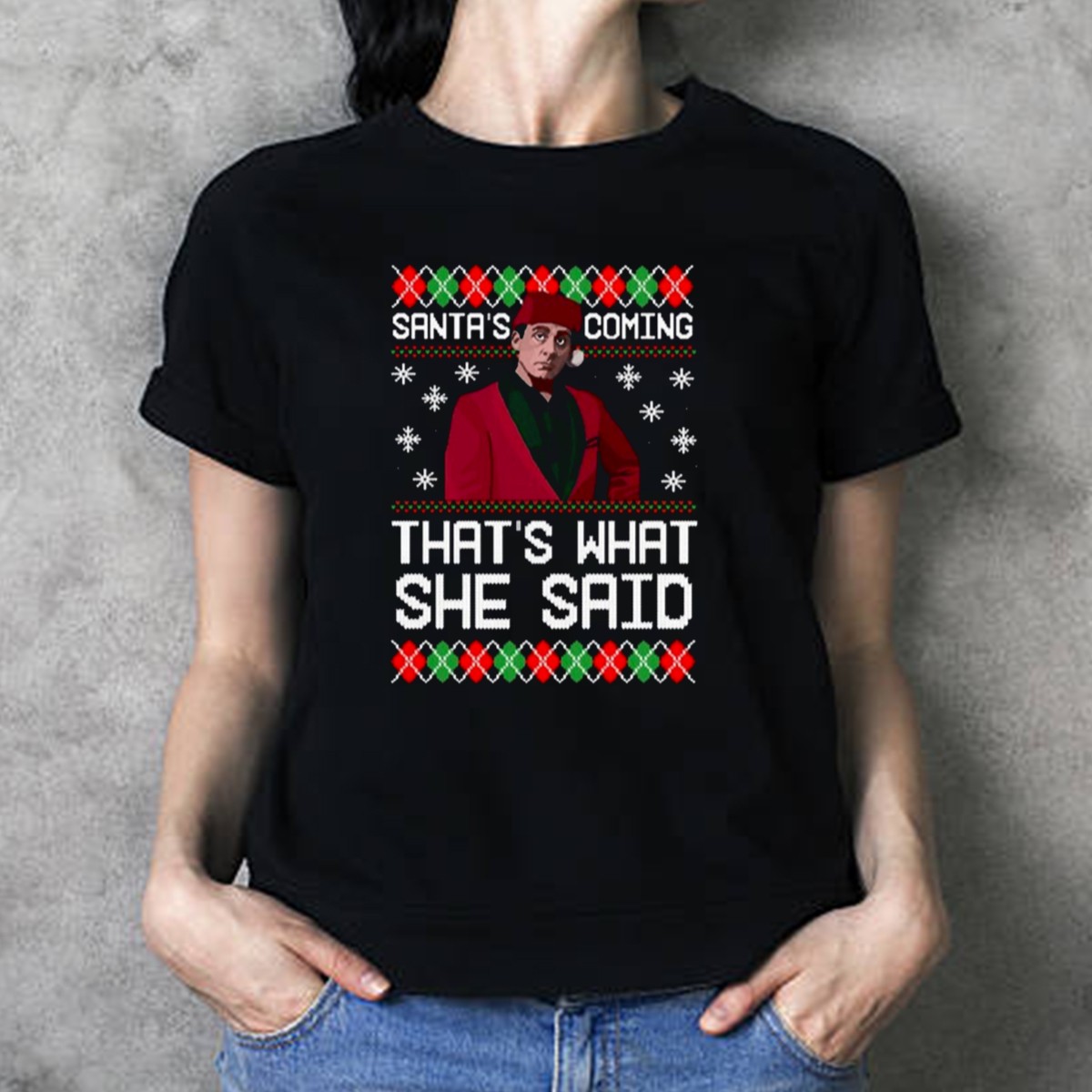Get ready to spread some holiday cheer with our fan-made “Santa’s Coming That’s What She Said” T-shirt, inspired by the beloved series The Office. Perfect for dedicated fans and anyone looking to add a touch of humor to their festive wardrobe, this classic tee is ideal for casual outings, themed events, or simply lounging around during the holiday season. Made with a soft and breathable fabric, this shirt not only showcases your love for the show but also ensures comfort during all those holiday gatherings!