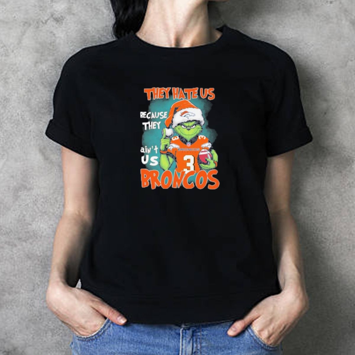 Embrace the holiday spirit with our “They Hate Us Because They Ain’t Us” Grinch Broncos Christmas T-shirt! Perfect for fans who want to showcase their team pride in a fun and festive way, this shirt features a playful design that’s sure to turn heads at casual gatherings, themed events, or even during your daily errands. Made for comfort and style, this fan-made shirt is printed right here in the USA, making it a unique addition to your wardrobe.