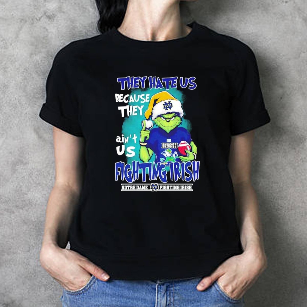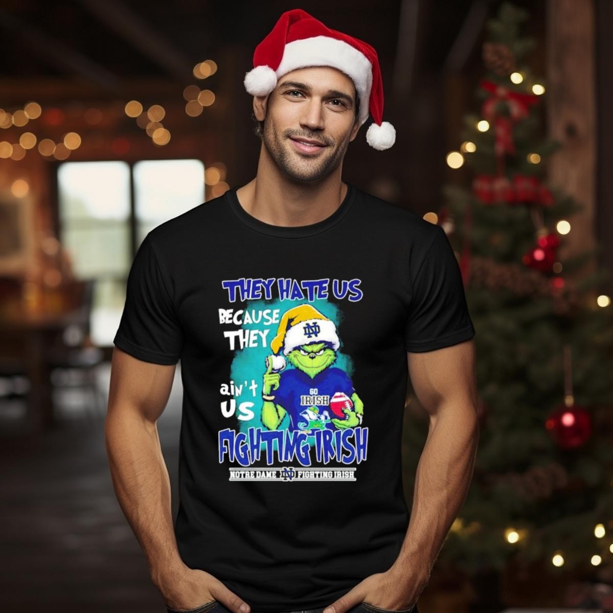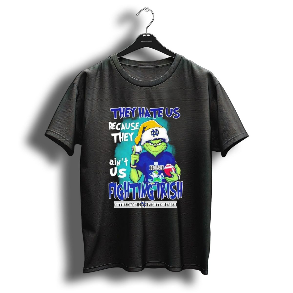 Celebrate the holiday season with a twist of humor and pride in our “They Hate Us Because They Aint Us Grinch Notre Dame Fighting Irish Christmas T-Shirt.” Perfect for die-hard fans of the Fighting Irish, this shirt combines festive cheer with your love for the game. Whether you’re heading to a themed event, a casual gathering, or just enjoying a cozy day at home, this unique fan-made design will have you standing out in style while showcasing your team spirit. Plus, it’s printed right here in the USA, ensuring quality and durability for all-season wear.