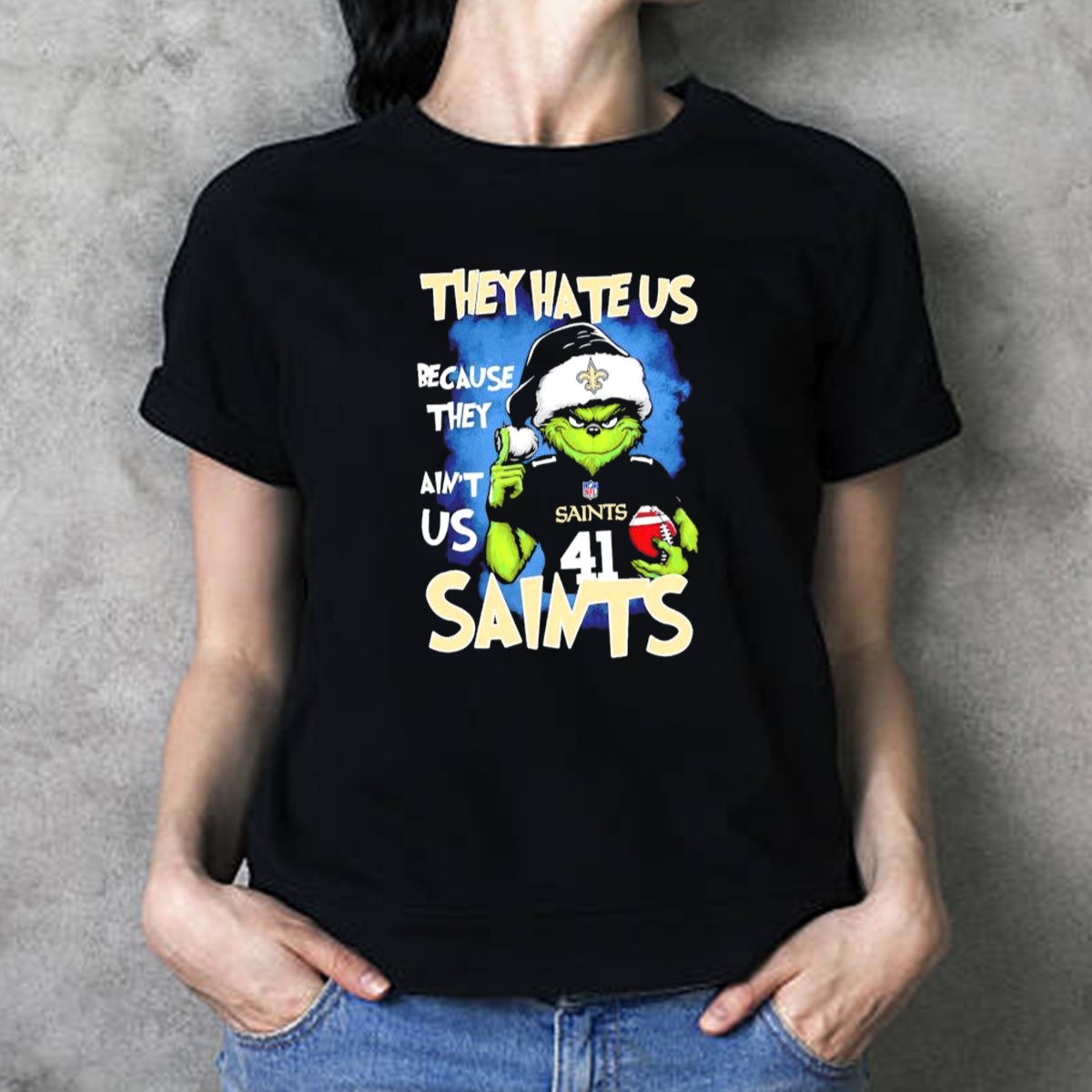 Get into the holiday spirit with our fan-made “They Hate Us Because They Aint Us” New Orleans Saints Grinch Christmas T-Shirt! Perfect for die-hard Saints fans, this shirt is ideal for casual wear, themed events, or just lounging around during the festive season. Made with love and printed in the USA, this unique design combines your team pride with a playful holiday twist, making it a must-have for any true supporter.
