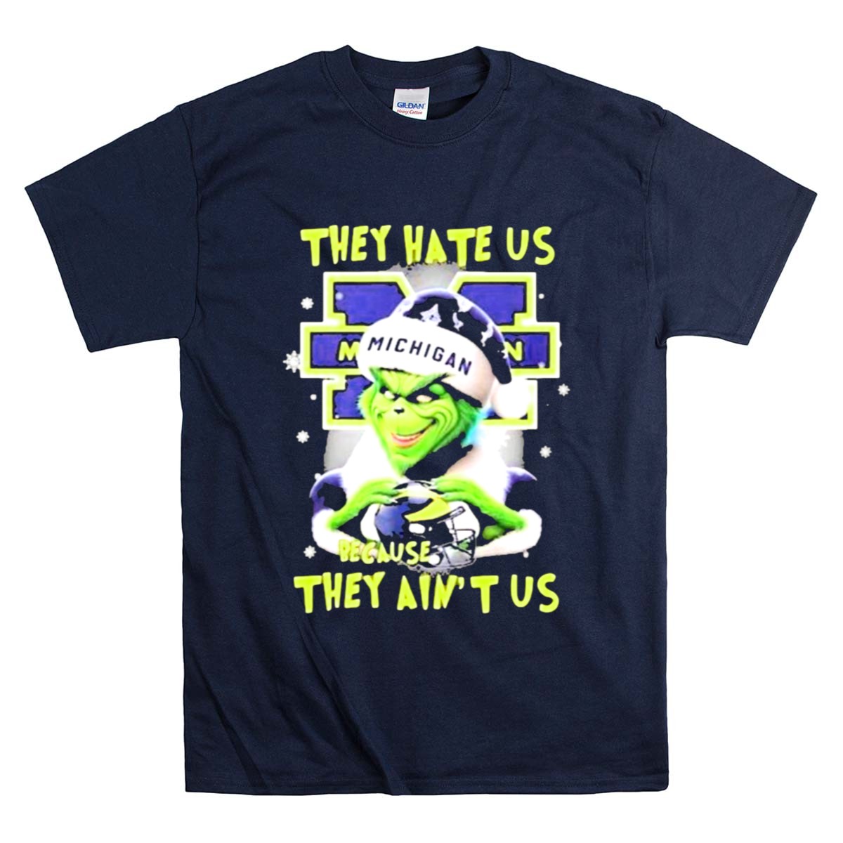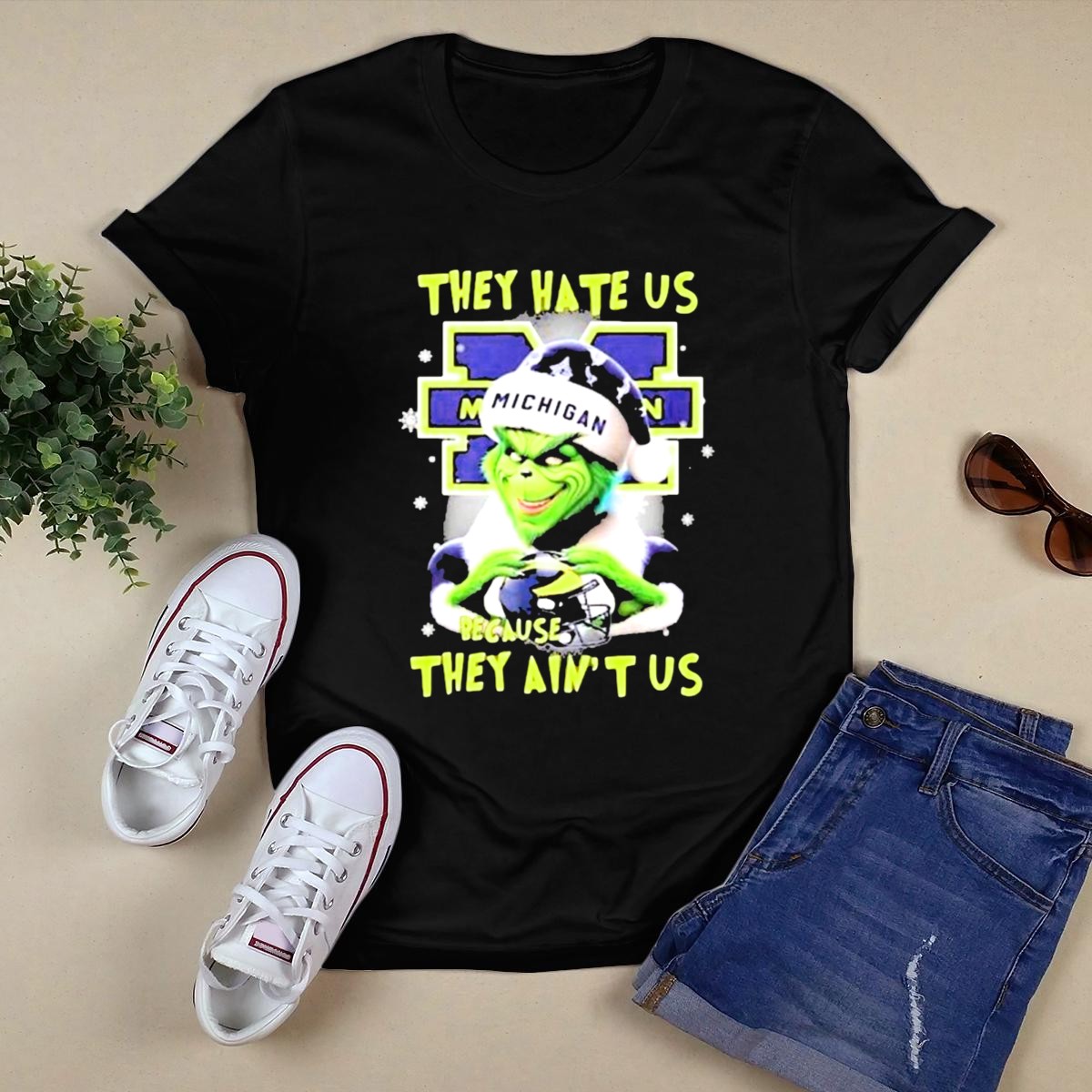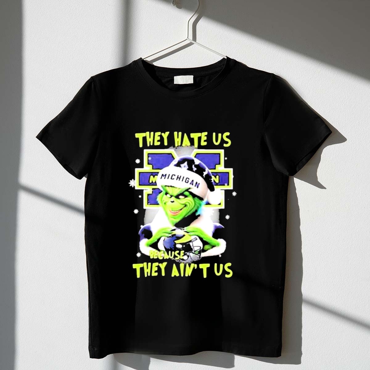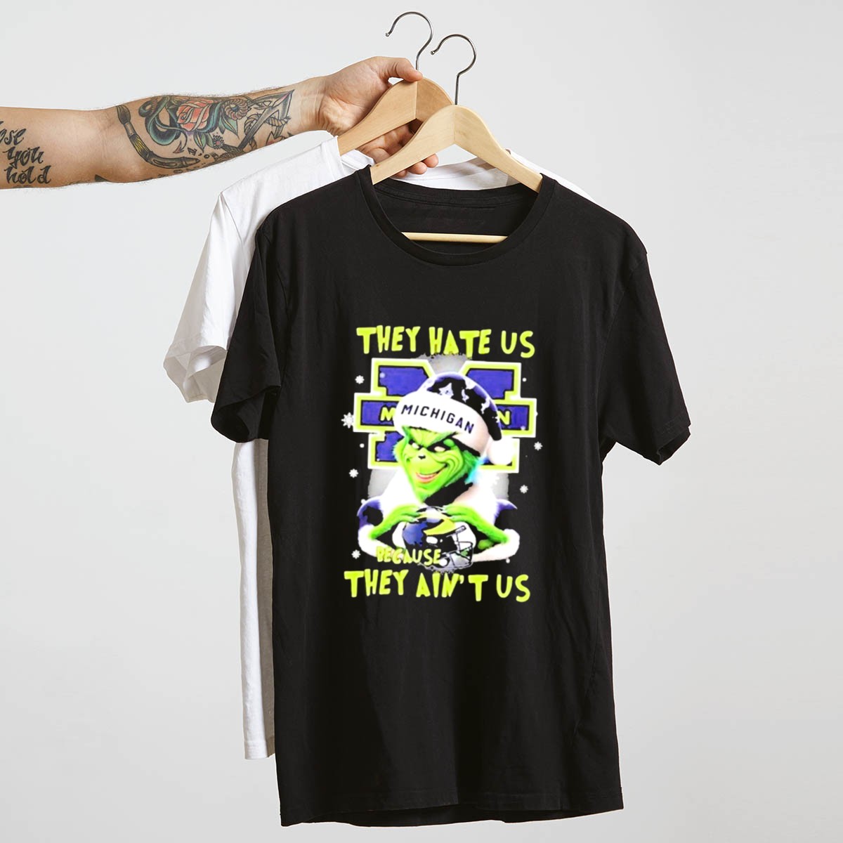 Show your team spirit and a touch of humor with the “They Hate Us Because They Aint Us” Santa Grinch Michigan Wolverines T-Shirt! Perfect for die-hard Wolverines fans, this shirt is ideal for casual outings, themed events, or just lounging around while you cheer for your favorite team. Made in the USA, this fan-made design not only showcases your loyalty but also stands out with its playful twist on a classic holiday theme.
