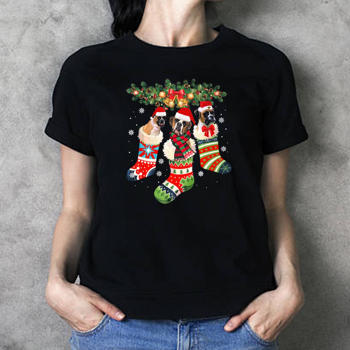 Be the first to review “Three Boxer Dogs In Festive Christmas Socks With Santa Hats And Holiday Garland T Shirt”
