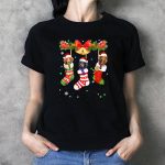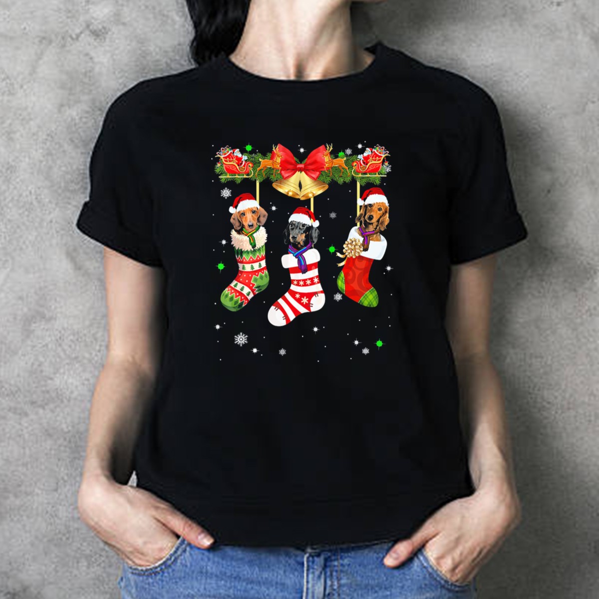 Be the first to review “Three Dachshunds In Christmas Stockings With Santa Sleigh And Bells T-Shirt”