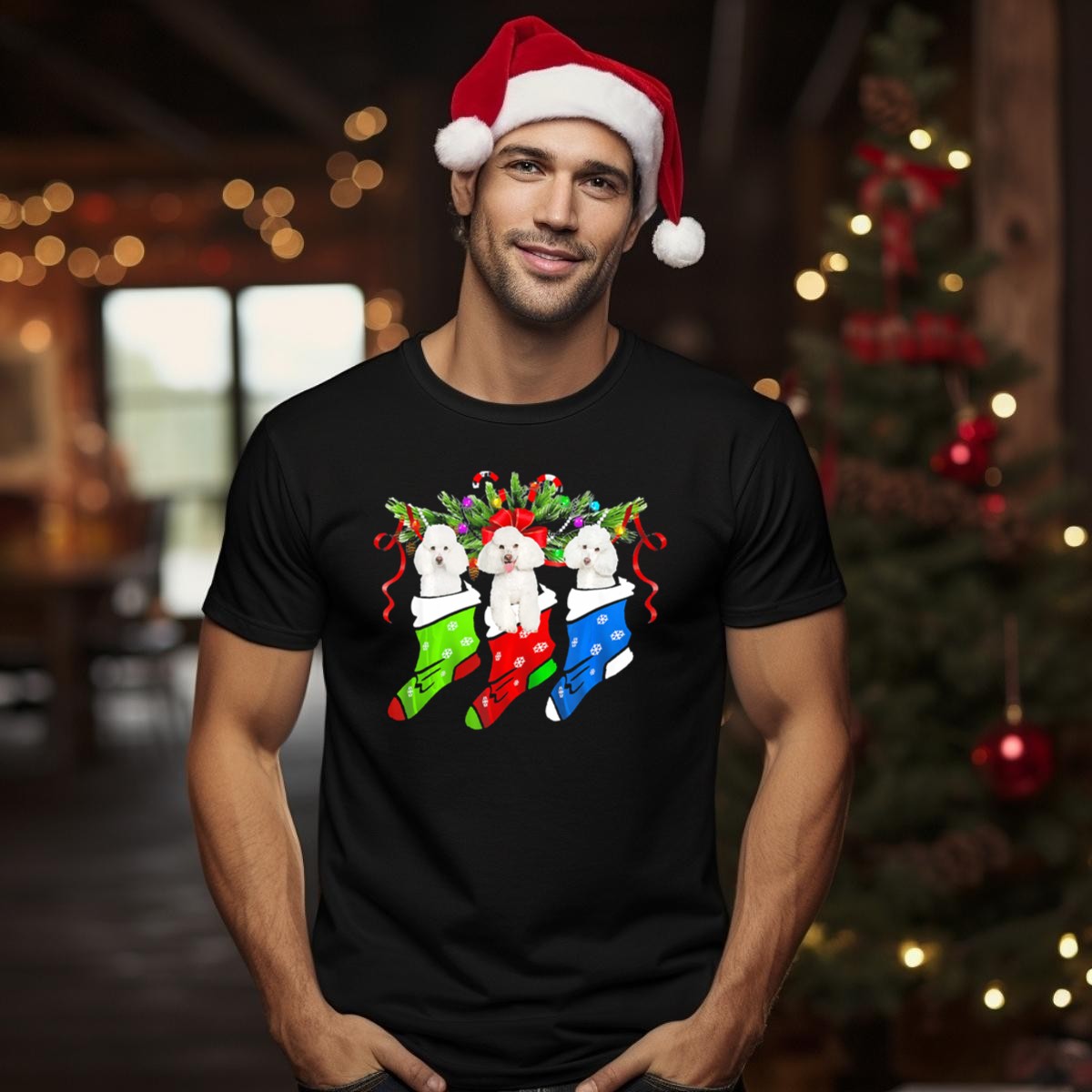 Celebrate the holiday season with our whimsical “Three Funny Poodles In Christmas Stockings” T-shirt! This delightful design is perfect for dog lovers and those who enjoy bringing a bit of festive cheer to their casual wear. Whether you’re attending a themed event, decorating for the holidays, or simply enjoying a cozy day at home, this shirt guarantees a smile and a touch of humor. Plus, it’s fan-made and printed in the USA, making it a unique addition to your wardrobe.