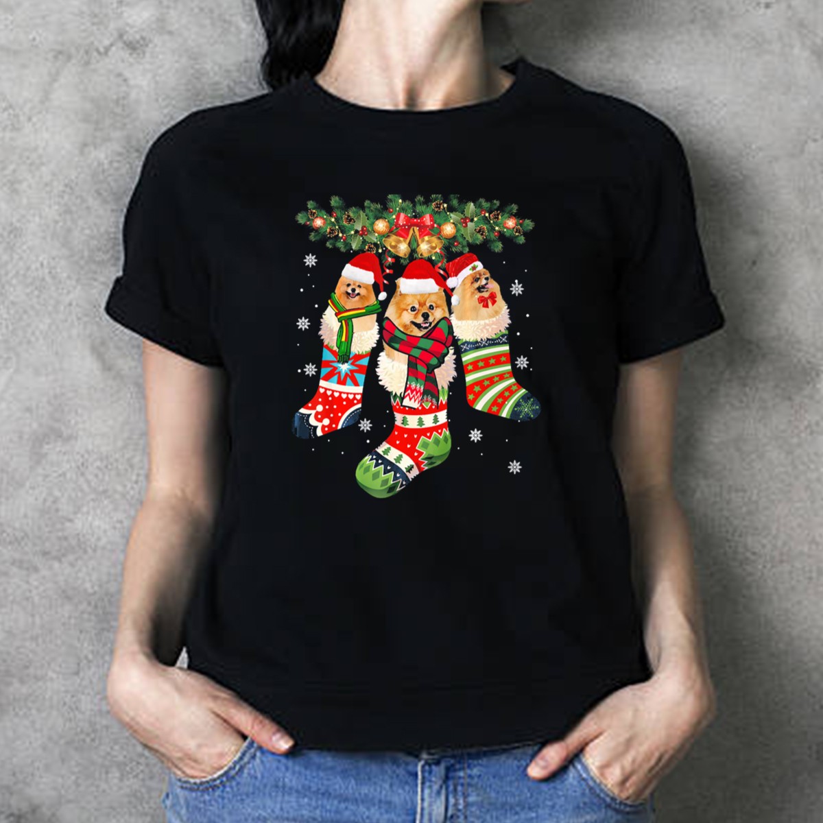 Celebrate the holiday spirit with our delightful “Three Pomeranian Dogs In Festive Christmas Stockings With Santa Hats” T-shirt! Perfect for dog lovers and festive enthusiasts alike, this shirt is a charming addition to your casual wardrobe. Whether you’re attending a holiday party, enjoying a cozy family gathering, or just spreading cheer during the season, this fan-made design, printed in the USA, is sure to bring smiles and warmth to every occasion.