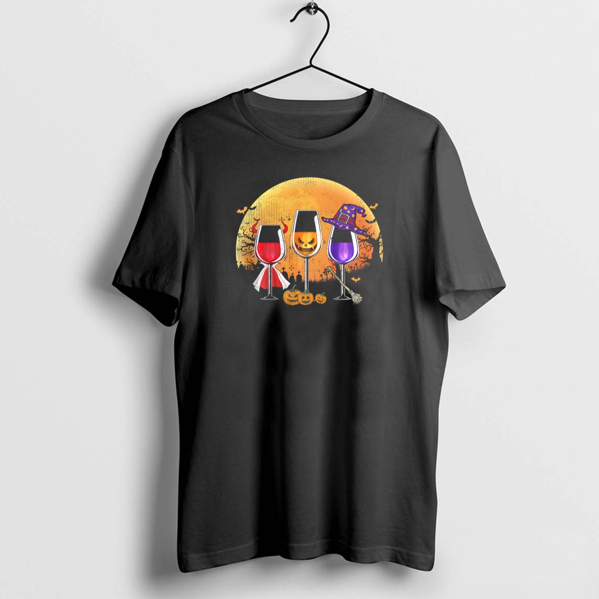 Be the first to review “Three Wine Glasses Halloween Pumpkin Witch Hat Bats Moon And Jack O Lanterns T-Shirt”
