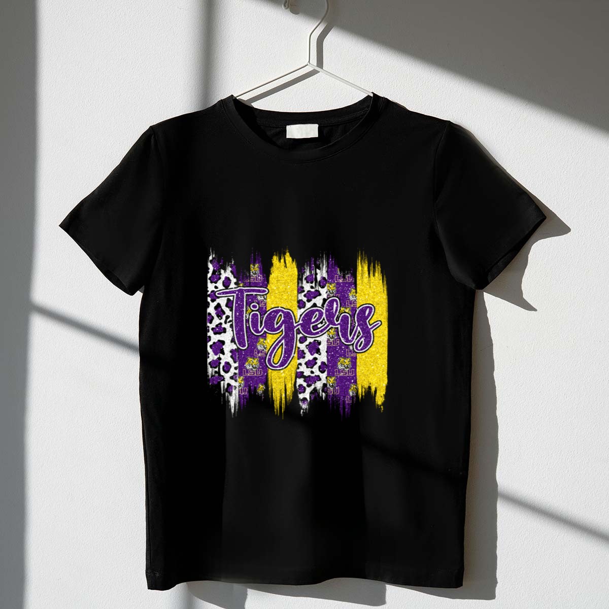 Show your fierce loyalty to the LSU Tigers with this vibrant purple and gold leopard brushstroke T-shirt. Perfect for passionate fans, this shirt combines a stylish design with ultimate comfort, making it ideal for casual outings, themed events, or daily wear. Made with care in the USA, it’s a unique addition to any fan’s wardrobe that proudly showcases your team spirit.