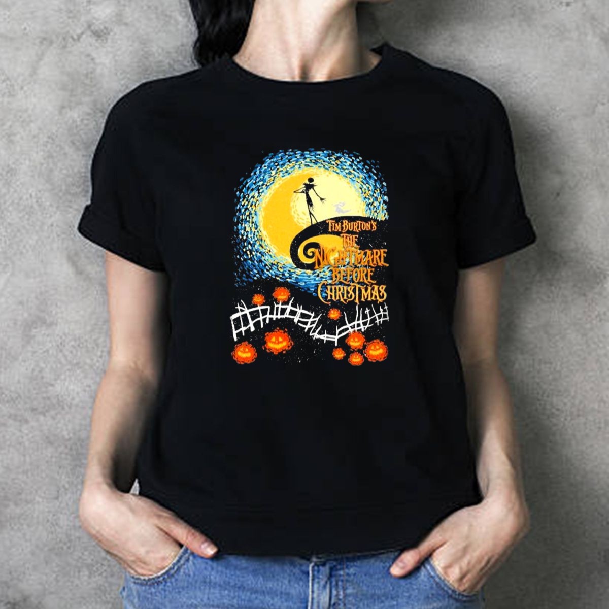 Celebrate the whimsical world of Tim Burton’s “The Nightmare Before Christmas” with our Starry Night Vintage Pumpkin Fence T-Shirt! Perfect for fans of all ages, this shirt captures the enchanting spirit of Halloween and Christmas in one unique design. Ideal for casual outings, themed events, or simply expressing your love for this iconic film, this fan-made piece is printed in the USA and crafted for comfort and style.