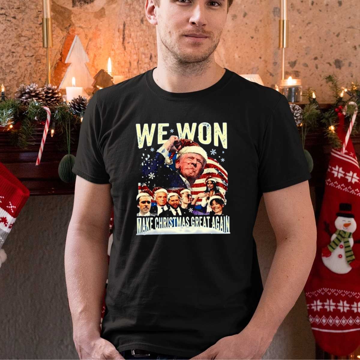 Trump 2024 We Won Make Christmas Great Again Santa Hat Flag Snowflakes T Shirt 1