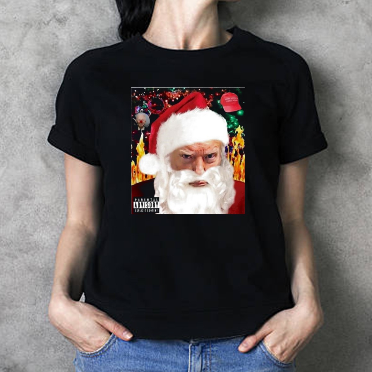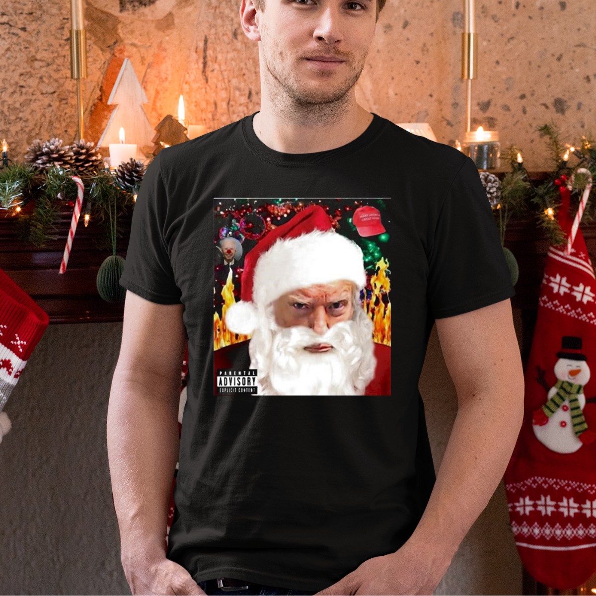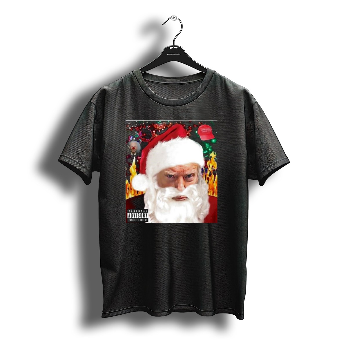 Get ready to spread some holiday cheer with a twist! Our Trump Santa Explicit Content Warning Hat Flames Christmas Clown T-Shirt is perfect for those who love to combine festive fun with a dash of humor. This fan-made design is ideal for themed events, casual outings, or daily wear, making it a versatile addition to your wardrobe. Printed in the USA, this shirt is sure to turn heads and spark conversations wherever you go!