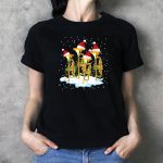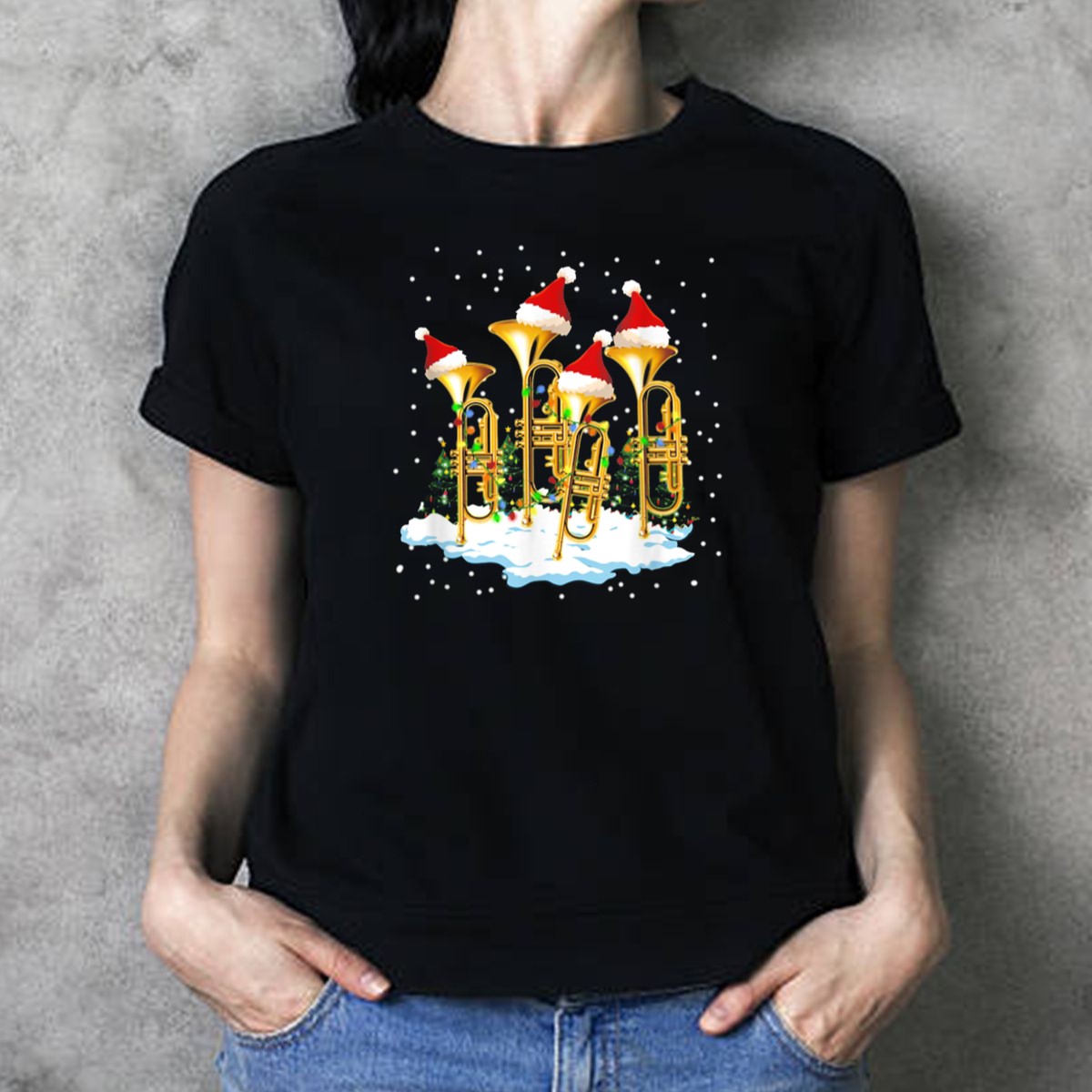 Be the first to review “Trumpet Christmas Tree Decor Snowy Holiday Trumpets With Santa Hats T Shirt 1”