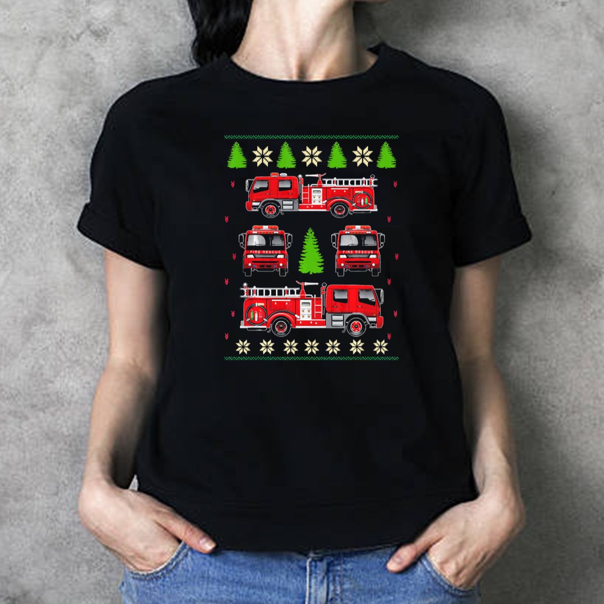 Ugly Christmas Firefighter Rescue Fire Truck Festive Holiday Trees Snowflakes T Shirt