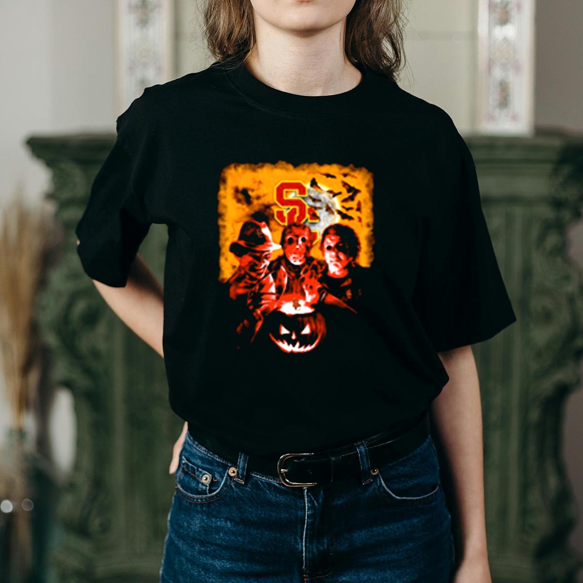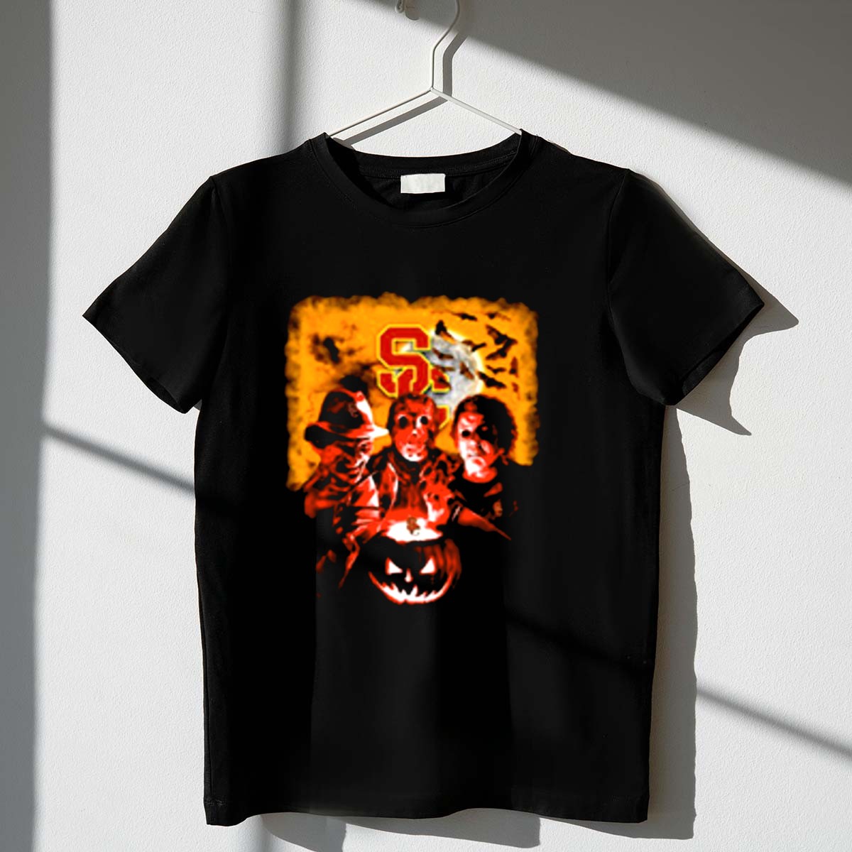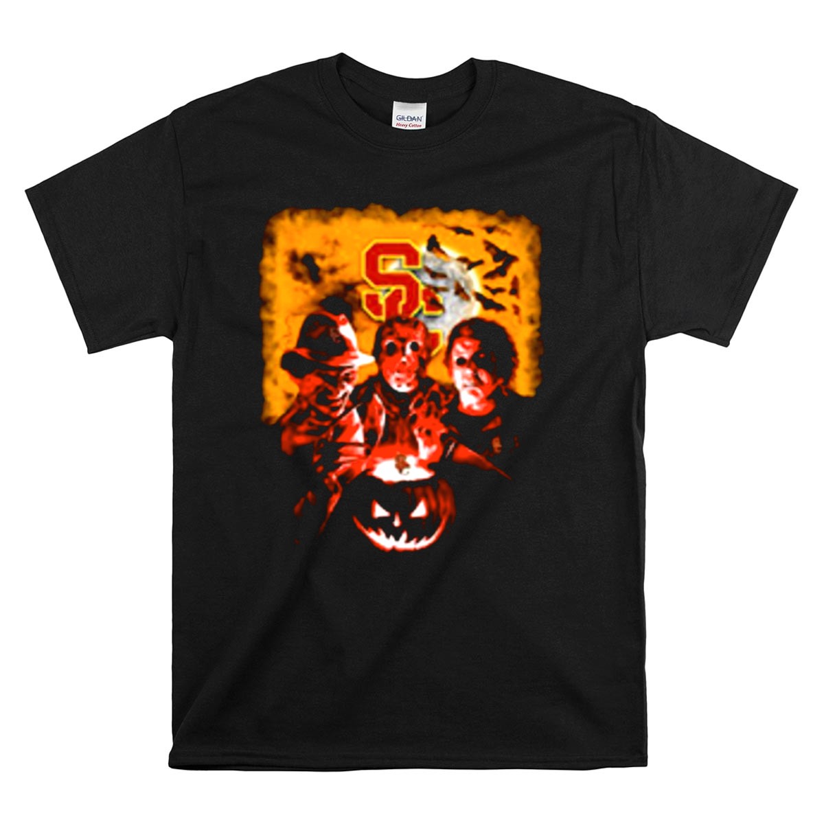 Get ready to celebrate Halloween in style with our USC Trojans Horror Movies T-Shirt! Featuring a fan-made design that pays homage to iconic horror characters like Freddy Krueger, Jason Voorhees, and Michael Myers, this shirt is perfect for USC Trojans fans who love a good scare. Whether you’re gearing up for a themed event, heading to a casual outing, or just want to showcase your love for horror films, this shirt is a must-have addition to your wardrobe. Made and printed in the USA, it combines school spirit with a spooky twist!