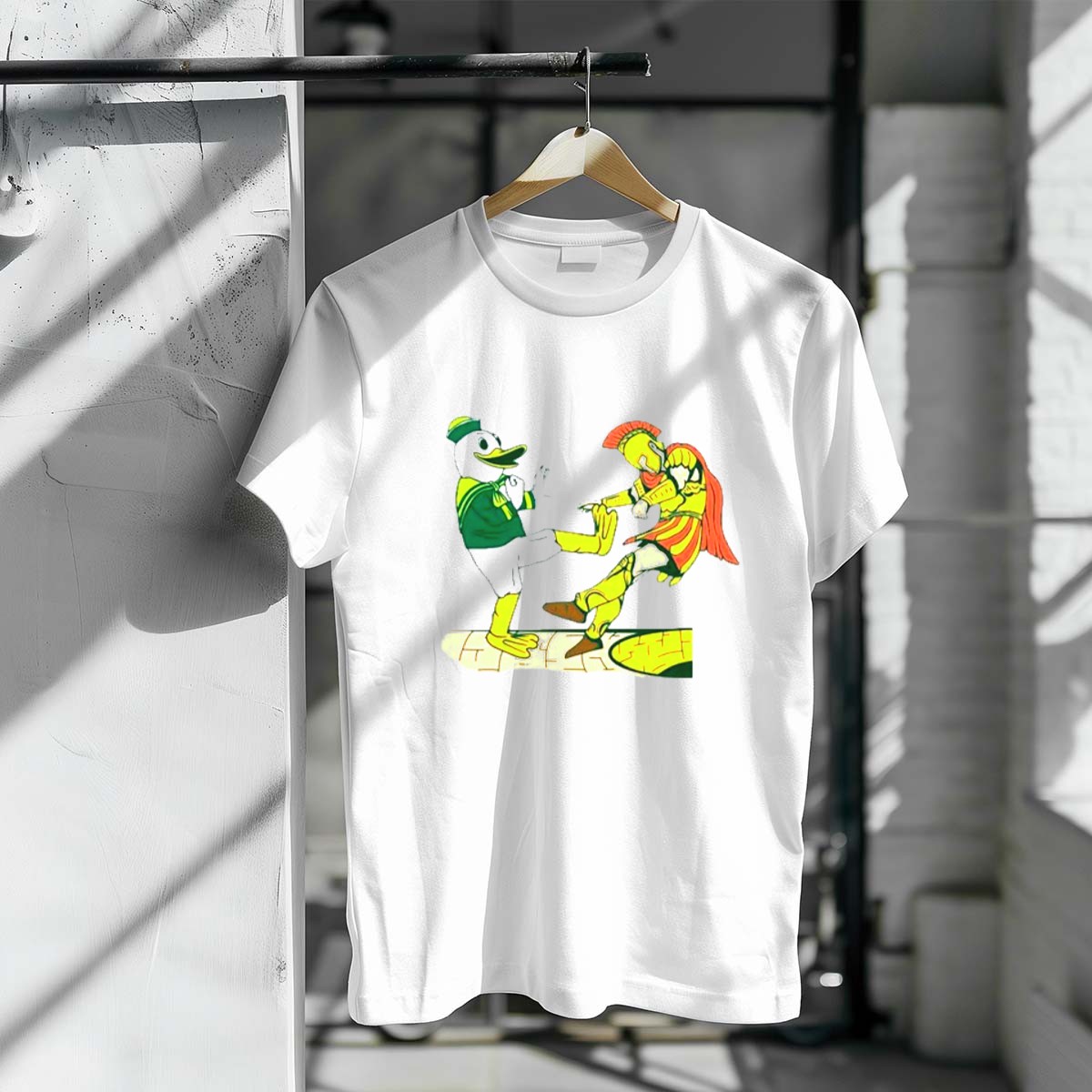 Show your team spirit with the USC Trojans versus Oregon Ducks Kick Scene T-Shirt! This fan-made design is perfect for die-hard football fans, capturing the excitement of the game in a stylish and comfortable way. Whether you’re cheering from the stands, attending a themed event, or just hanging out with friends, this shirt is your go-to choice for casual wear. Made in the USA, it combines quality and creativity for a standout piece in your wardrobe.