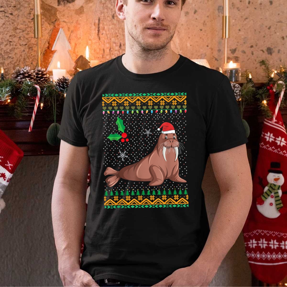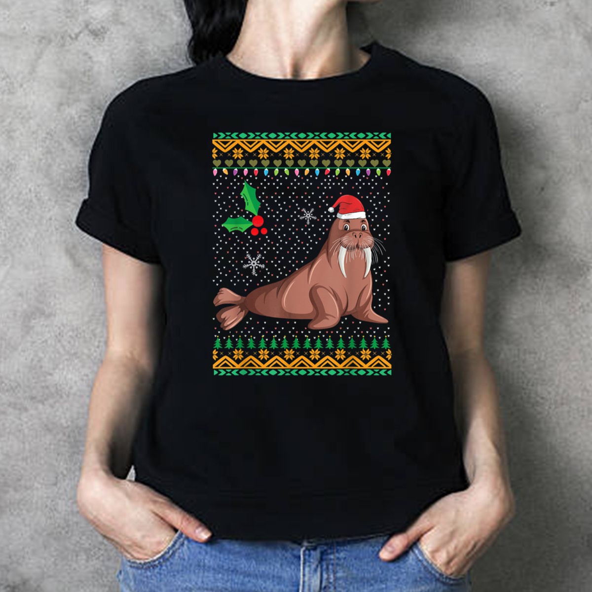 Be the first to review “Walrus Ugly Christmas Floral Xmas Vacation Santa Hat Holly Lights Snowflakes Trees T Shirt”