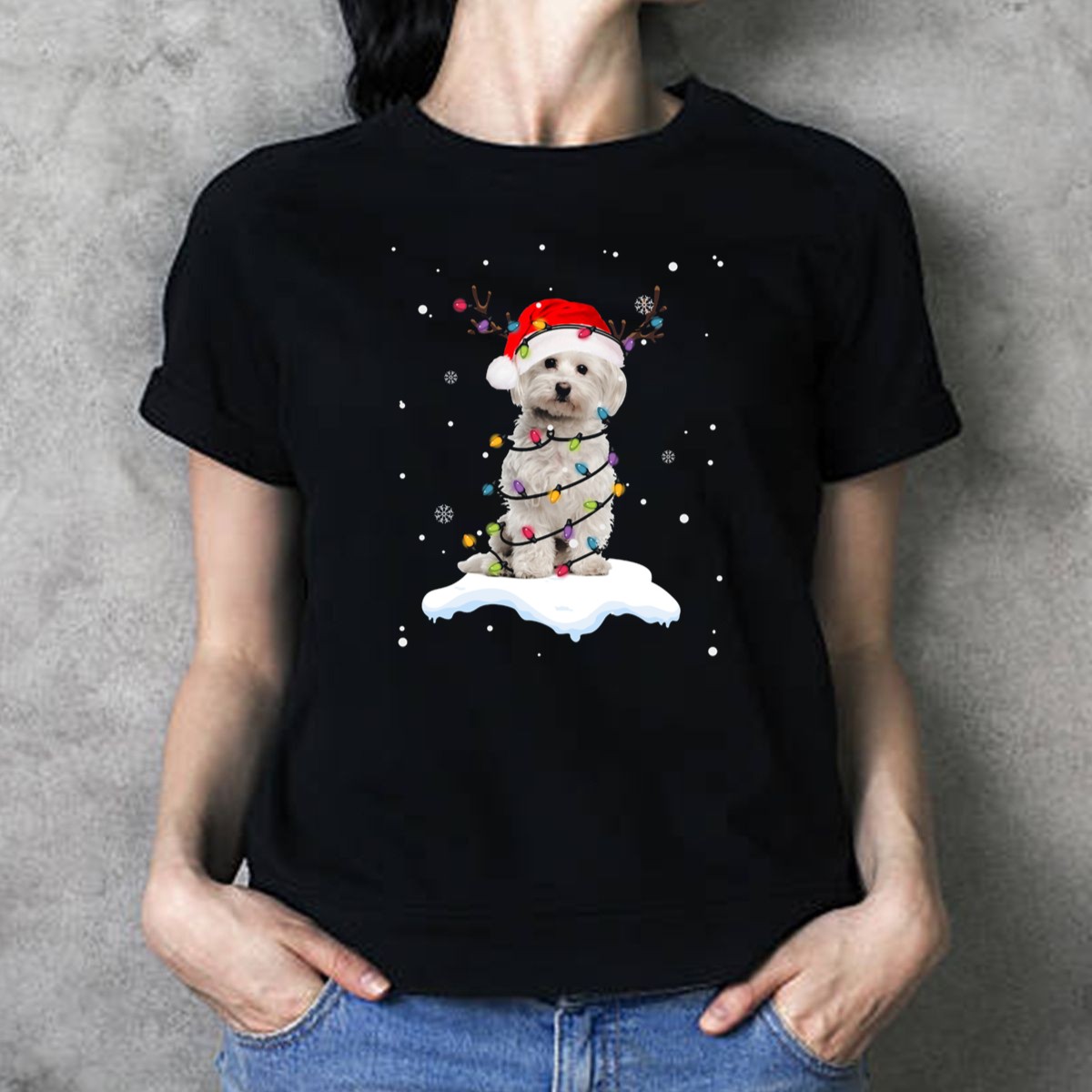 West Highland White Terrier Santa Hat Wrapped In Christmas Lights Snowflakes And Reindeer Antlers T Shirt