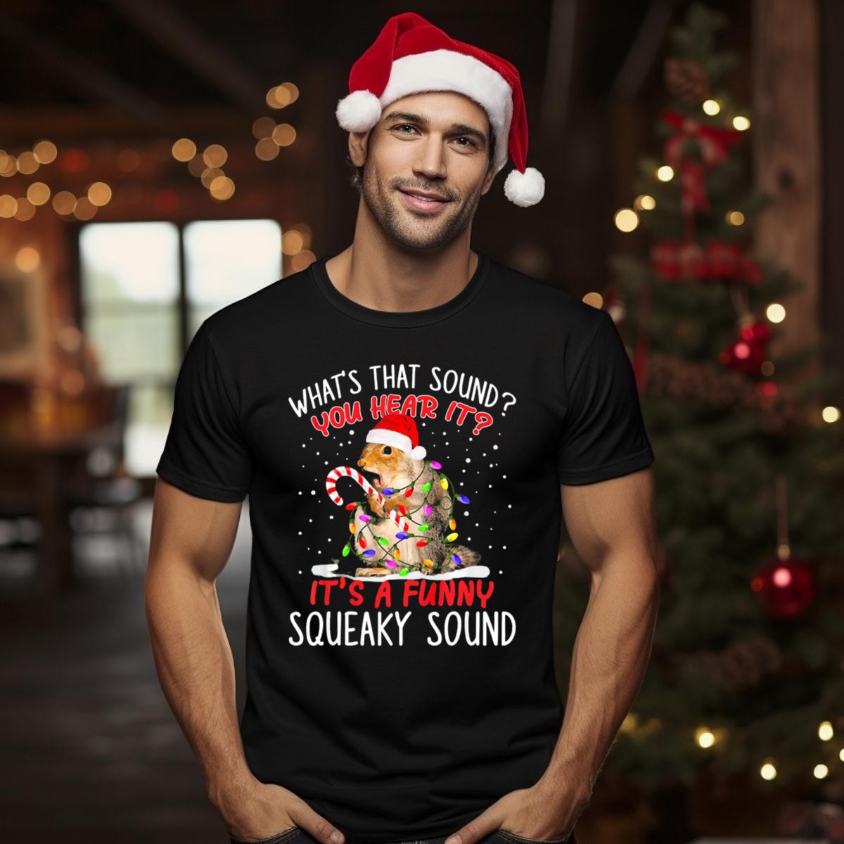 Be the first to review “Whats That Sound You Hear It Its A Funny Squeaky Sound Santa Hat Squirrel Christmas Lights Candy Cane T-Shirt”