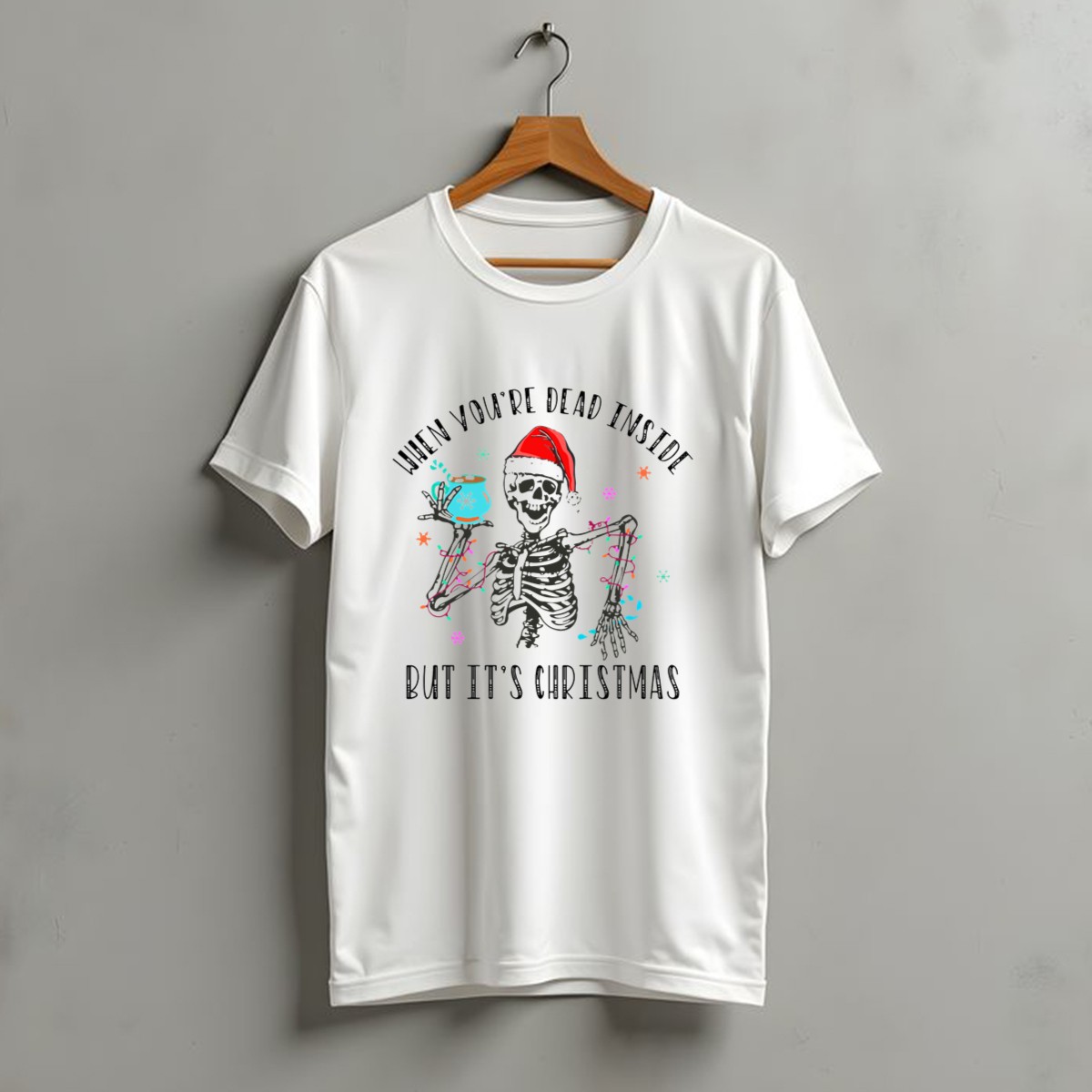 Embrace the holiday spirit with a twist of humor in our “When You’re Dead Inside But It’s Christmas” Skeleton Santa Hat Coffee Lights T-Shirt! Perfect for those who love to celebrate the season with a touch of irony, this shirt is designed for anyone who appreciates unique, fan-made designs. Whether you’re attending a casual gathering, a themed event, or just lounging at home, this shirt captures the essence of festive fun while keeping it real. Printed in the USA, it’s a must-have for your all-season wardrobe!