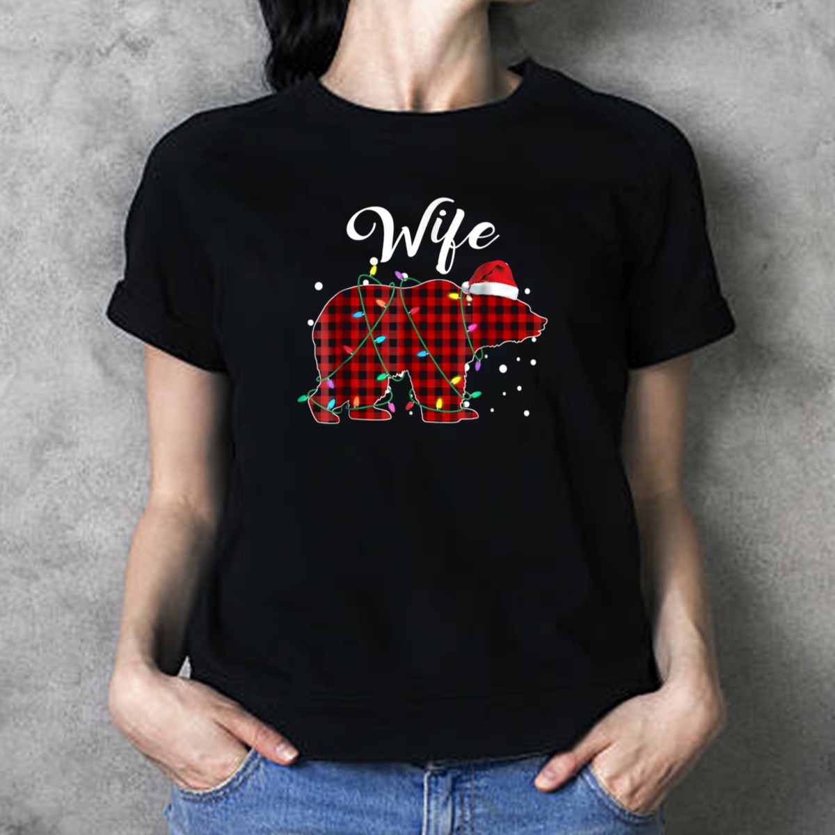 Celebrate the festive spirit with our Wife Red Plaid Bear Buffalo Christmas Lights Santa Hat T-Shirt! Perfect for the holiday season, this fun and cheerful shirt is designed for wives who embrace the joy of Christmas. Whether you’re attending a themed event, decorating the tree, or simply enjoying casual outings with your loved ones, this unique fan-made design adds a touch of whimsy to your wardrobe. Printed in the USA, it’s a must-have for anyone looking to spread holiday cheer!