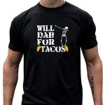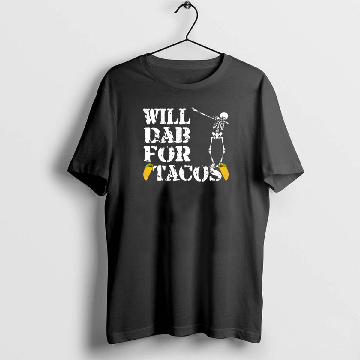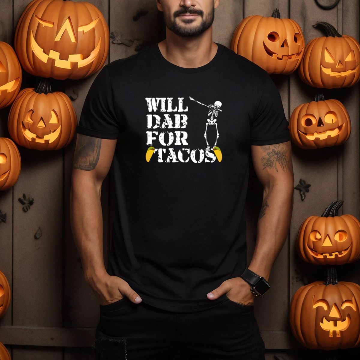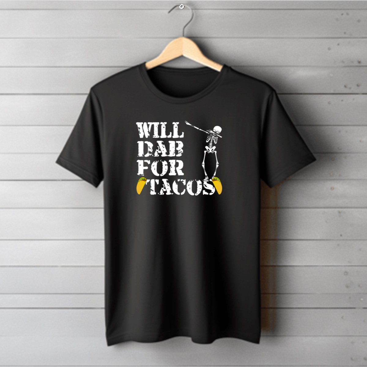Get ready to bring some fun to your Halloween festivities with our “Will Dab For Tacos” Skeleton T-Shirt! Perfect for taco lovers and Halloween enthusiasts alike, this fan-made design adds a humorous twist to your seasonal wardrobe. Whether you’re attending a themed party, heading out for a casual day with friends, or just enjoying a taco feast, this shirt is a must-have for any occasion. With its soft and breathable fabric, you’ll stay comfortable while showing off your playful spirit!