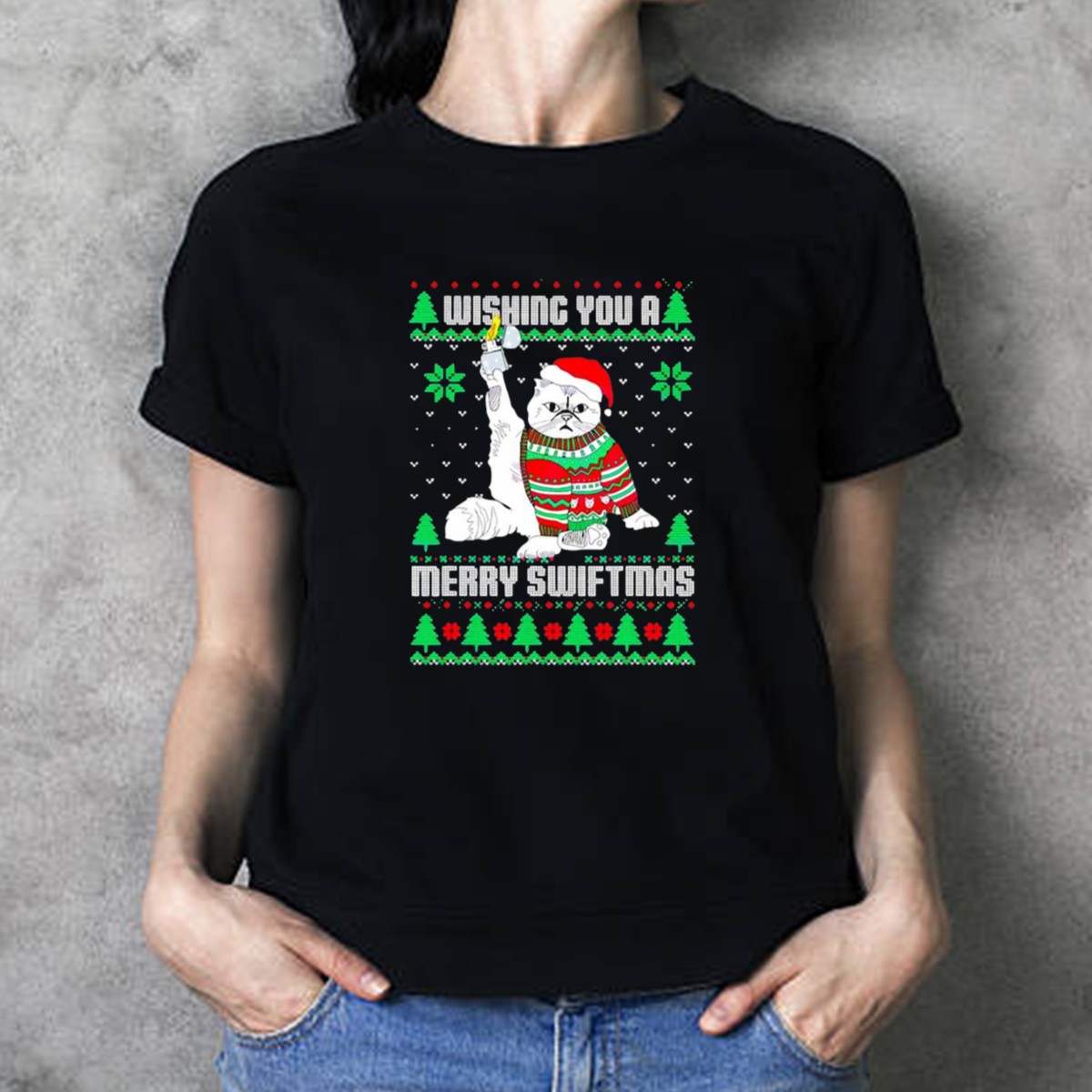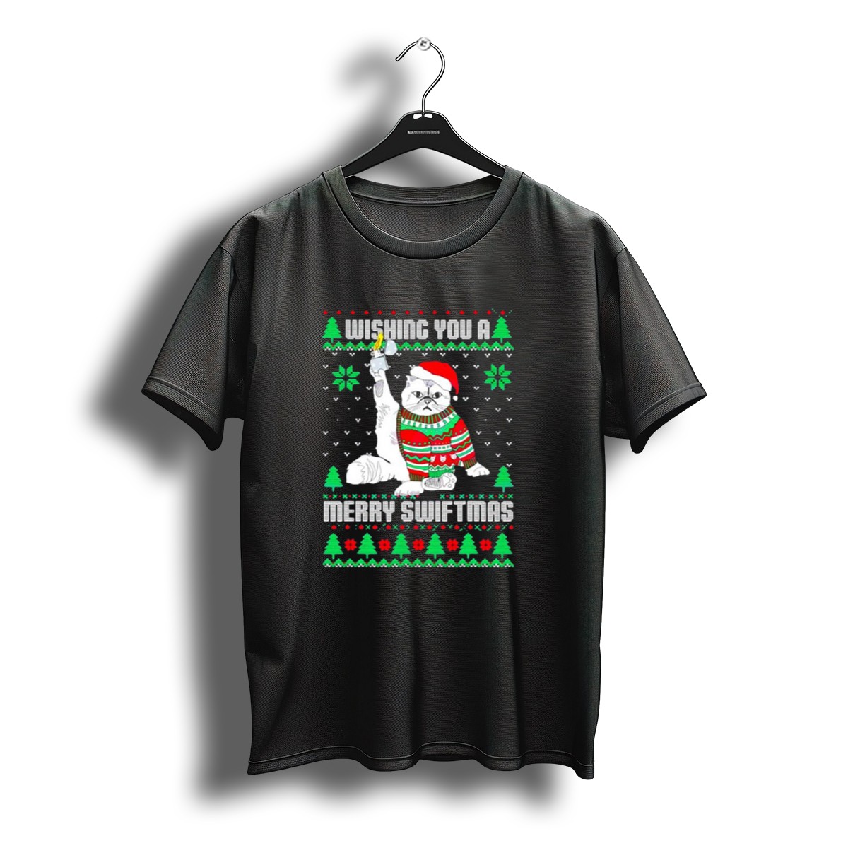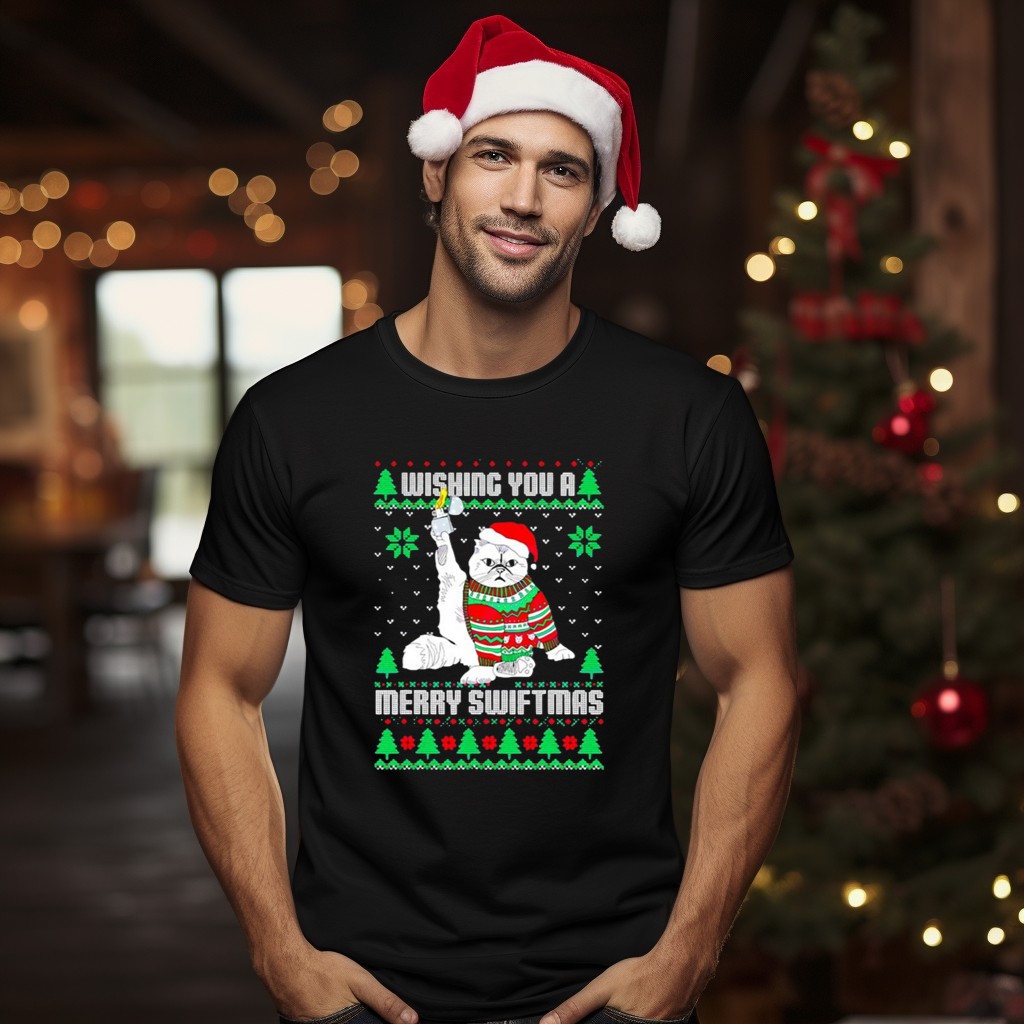 Get ready to spread some holiday cheer with our Wishing You A Merry Swiftmas Cat Santa Ugly Christmas T-Shirt! Perfect for cat lovers and fans of festive fun, this shirt features an eye-catching design that combines the whimsical charm of a Santa cat with a playful nod to the holiday season. Ideal for casual wear, themed events, or simply lounging around during the festivities, this shirt is sure to be a hit at any holiday gathering. Made with comfort in mind, it’s perfect for anyone looking to celebrate in style!