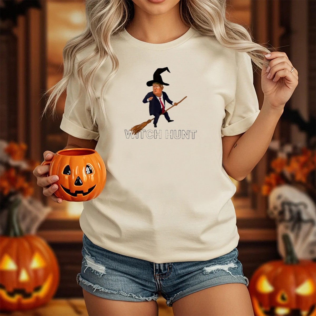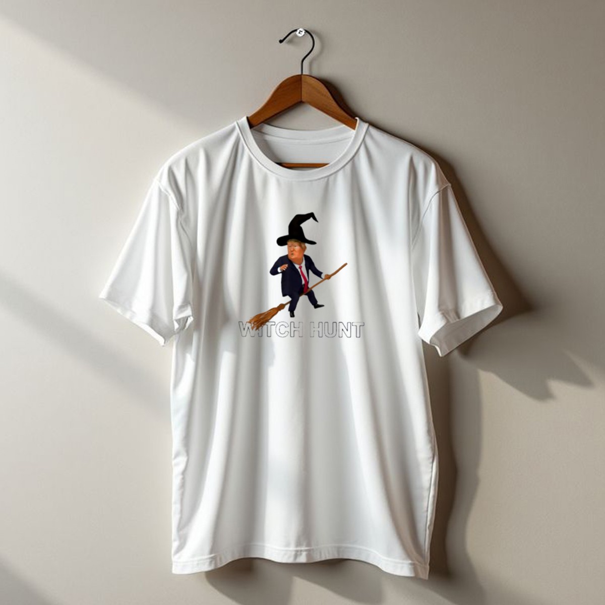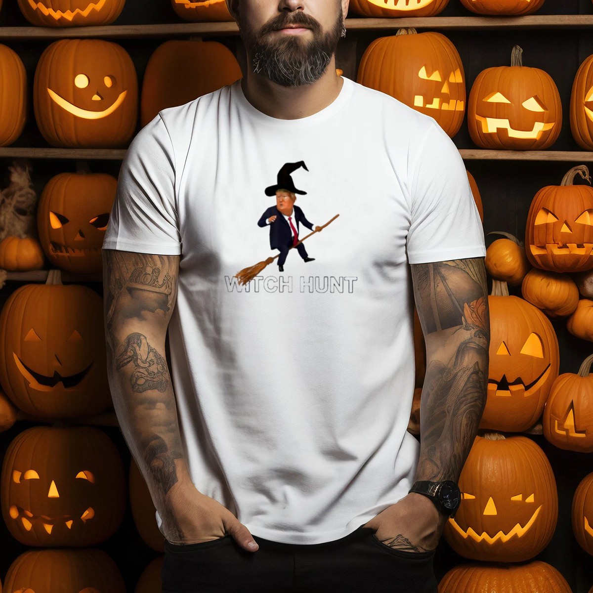 Embrace the spirit of Halloween with our Witch Hunt Trump On Broom T-Shirt, perfect for those who love to add a touch of humor to their festive celebrations. This fan-made design is ideal for casual outings, themed events, or just lounging around on a spooky night. Crafted for comfort and style, it’s a unique addition to your wardrobe that showcases your playful side while making a statement.