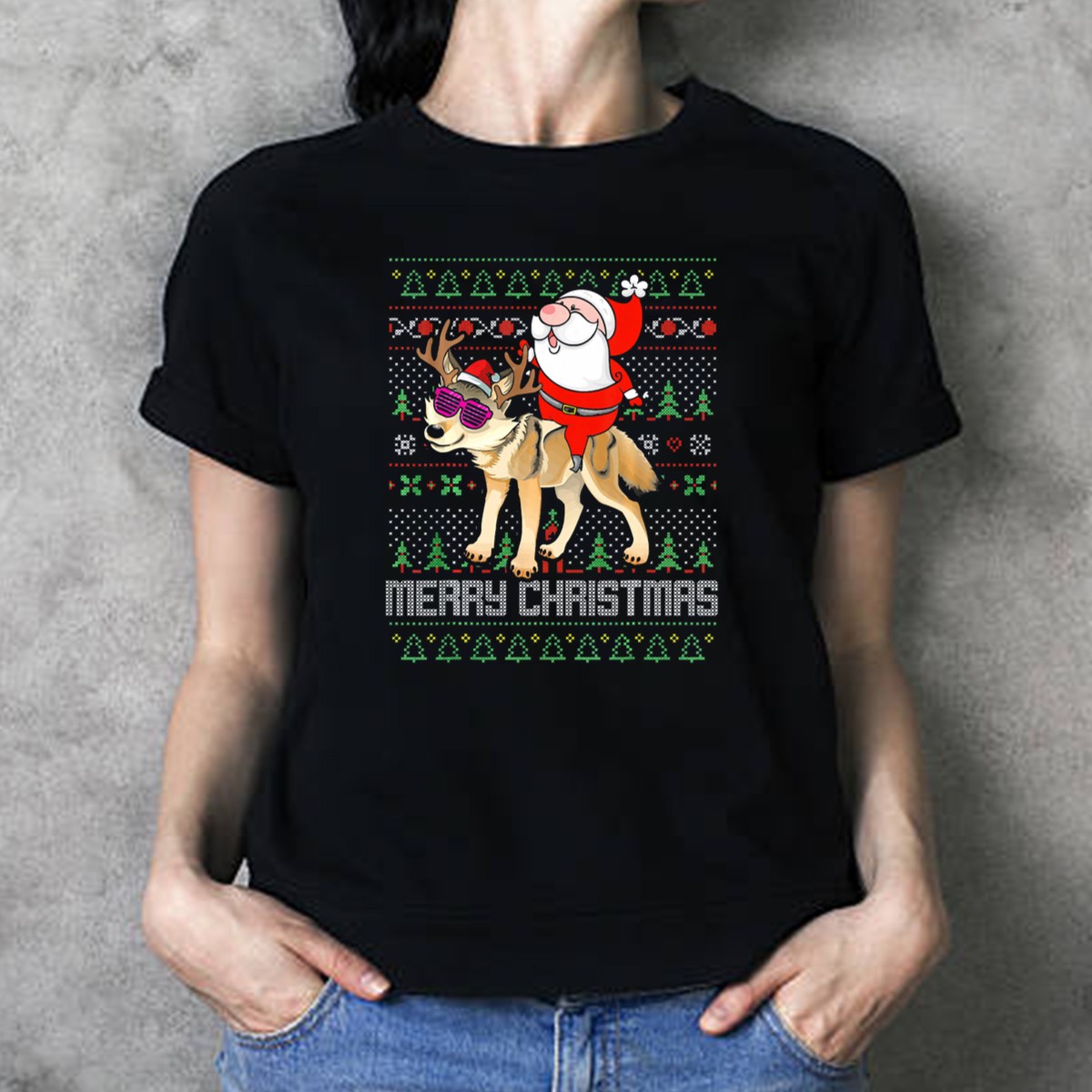 Wolf Santa Claus Merry Christmas Retro Sunglasses Antlers T-Shirt