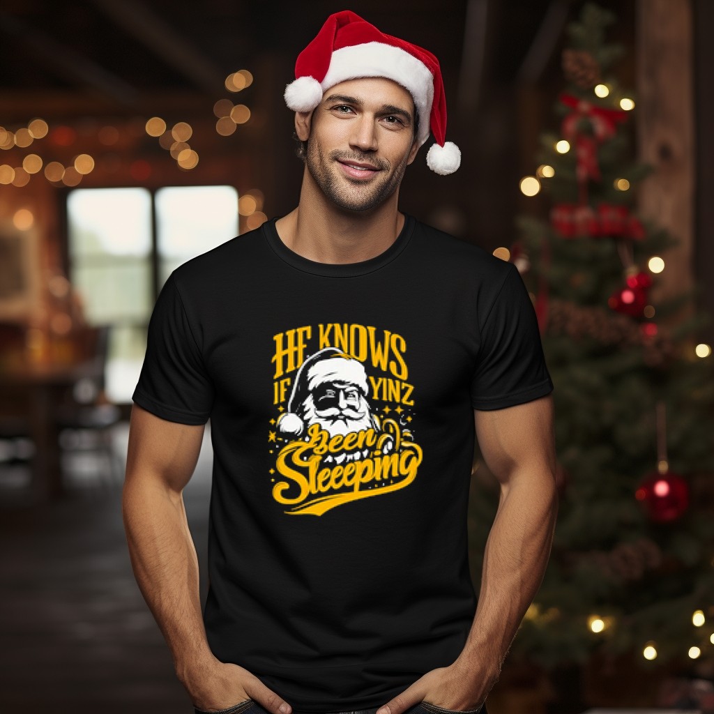 Yinzer Santa Christmas He Knows If Yinz Been Sleeeping Pittsburgh T-Shirt