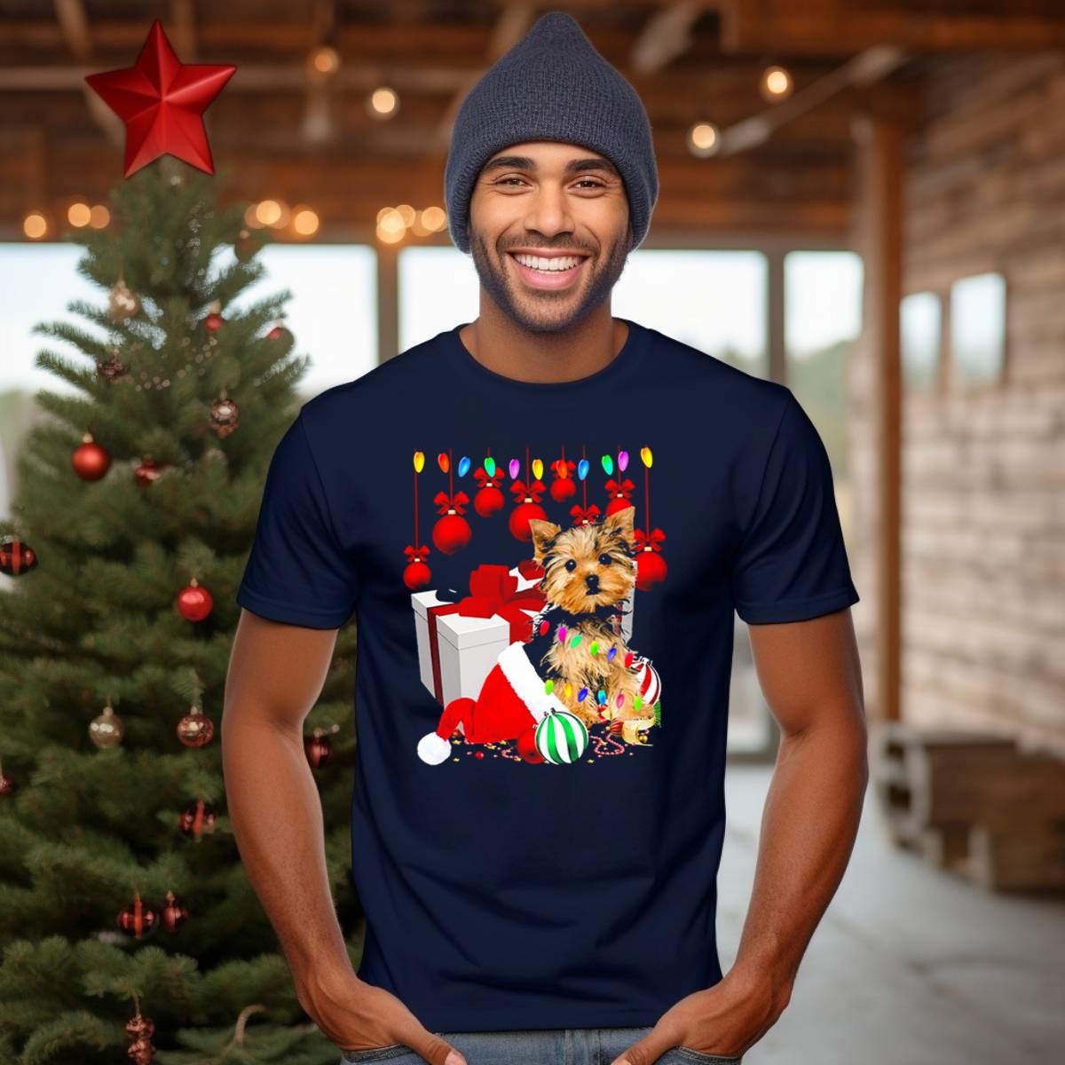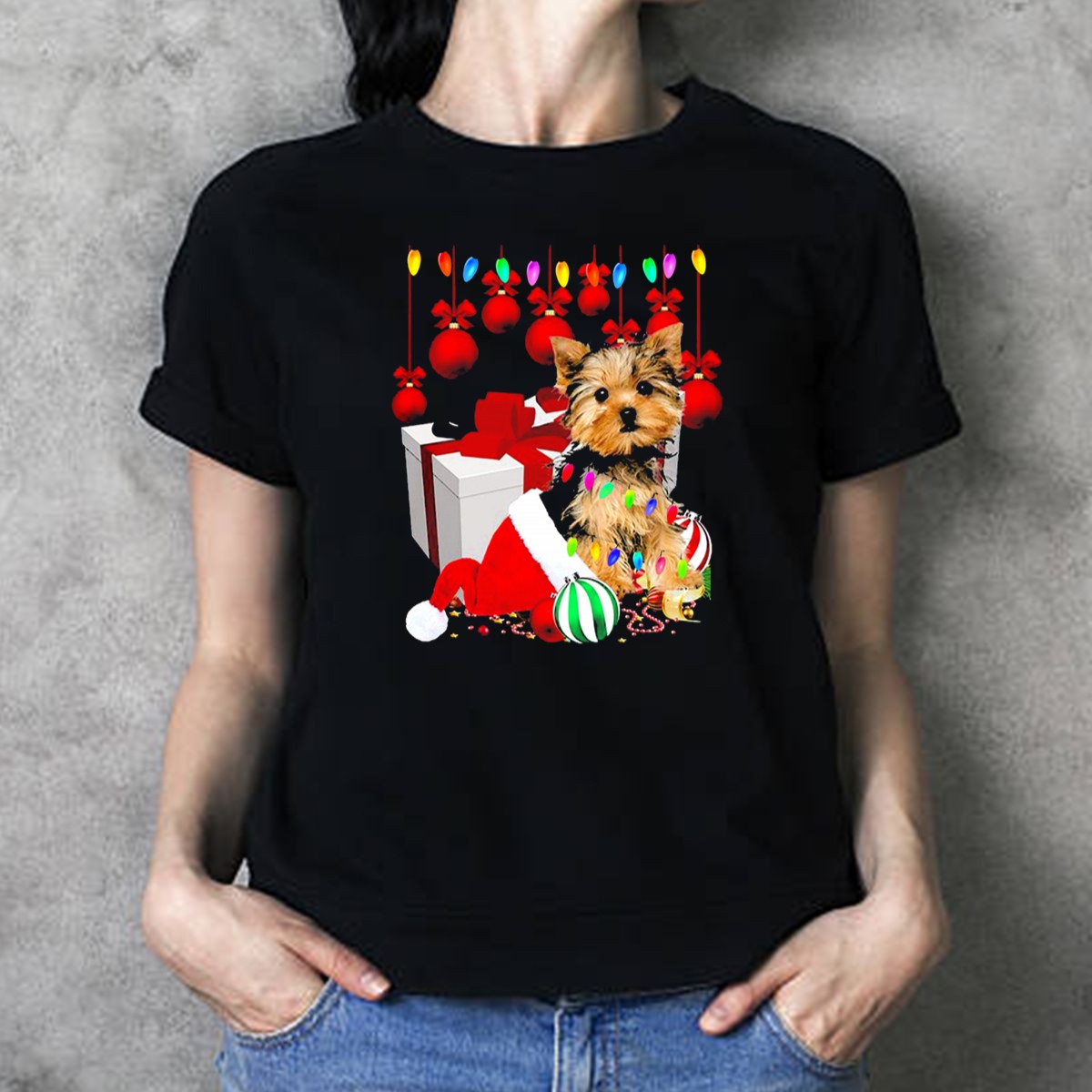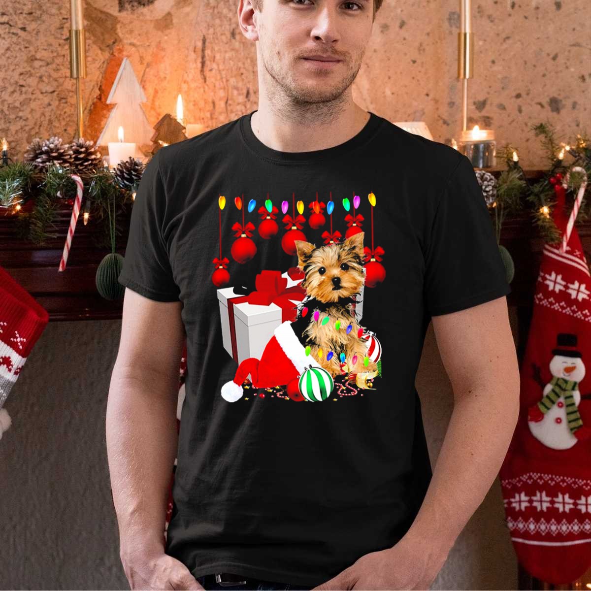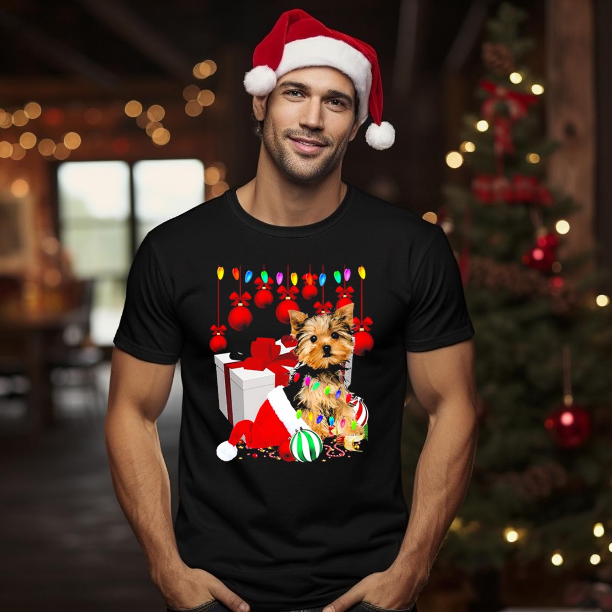 Be the first to review “Yorkie Puppy In Santa Hat With Christmas Ornaments And Lights T Shirt”