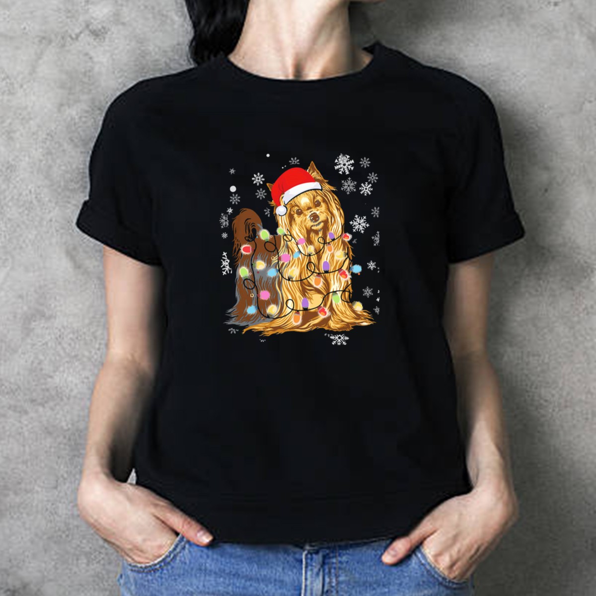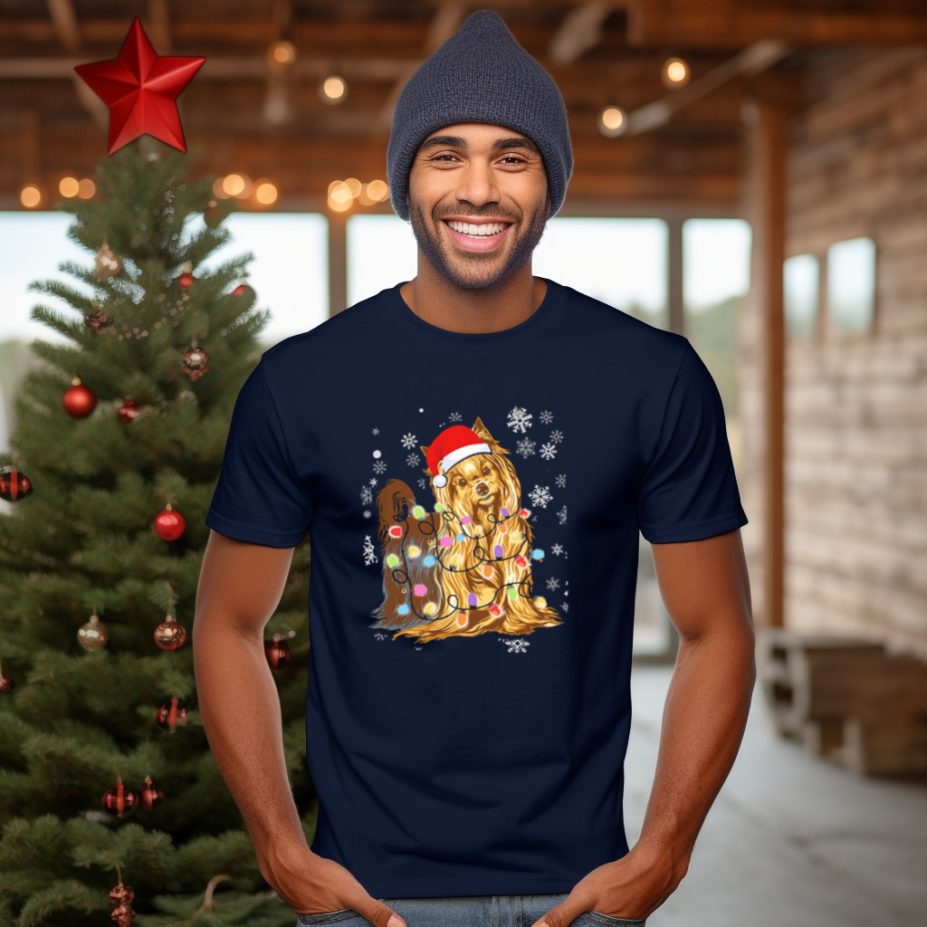 Celebrate the festive season with our Yorkshire Terrier Christmas Lights Snowflakes Santa Hat T-Shirt! Perfect for dog lovers and holiday enthusiasts alike, this charming tee showcases an adorable design that captures the spirit of Christmas in a fun and playful way. Whether you’re attending a family gathering, a themed party, or simply enjoying daily wear during the holidays, this shirt is a delightful addition to your wardrobe. Made with quality materials and printed in the USA, it’s a unique fan-made piece that stands out in any casual setting.