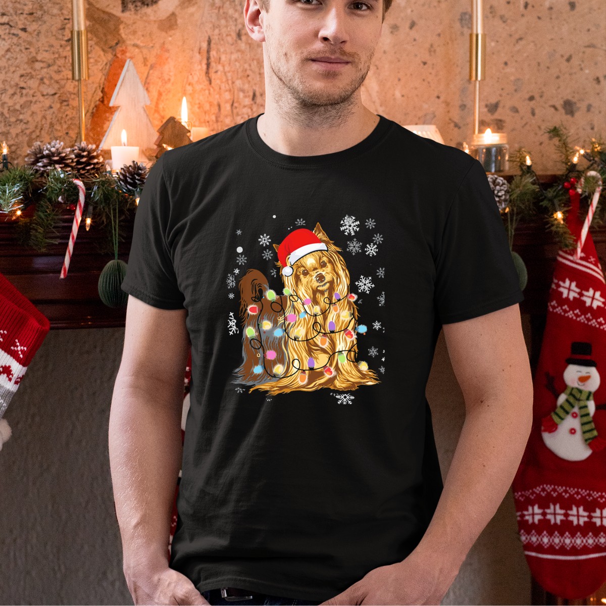 Be the first to review “Yorkshire Terrier Christmas Lights Snowflakes Santa Hat T-Shirt”