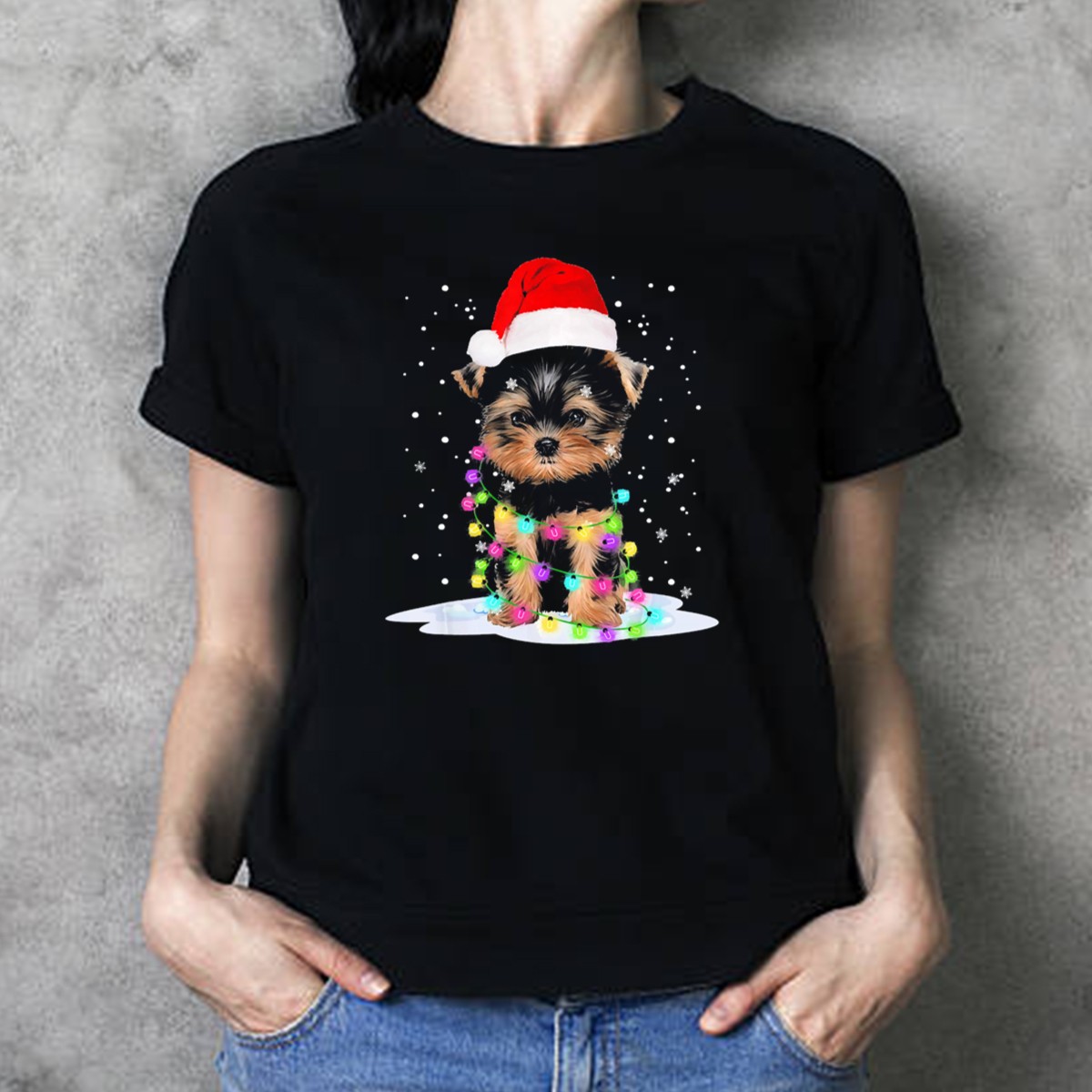Celebrate the festive season with our charming Yorkshire Terrier in Santa Hat T-Shirt, designed for dog lovers and holiday enthusiasts alike. Perfect for casual wear, themed events, or just spreading holiday cheer, this delightful tee showcases an adorable design featuring a Yorkshire Terrier adorned with a Santa hat, surrounded by sparkling Christmas lights and whimsical snowflakes. Made with love and printed in the USA, this shirt is sure to make you and fellow dog lovers smile during all your seasonal gatherings.