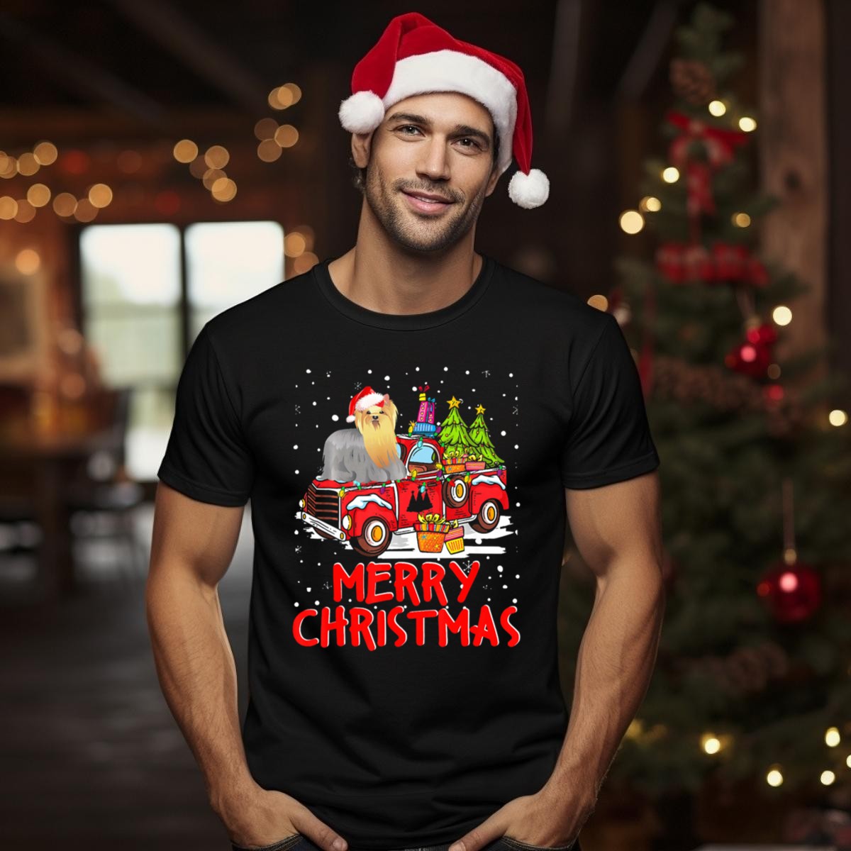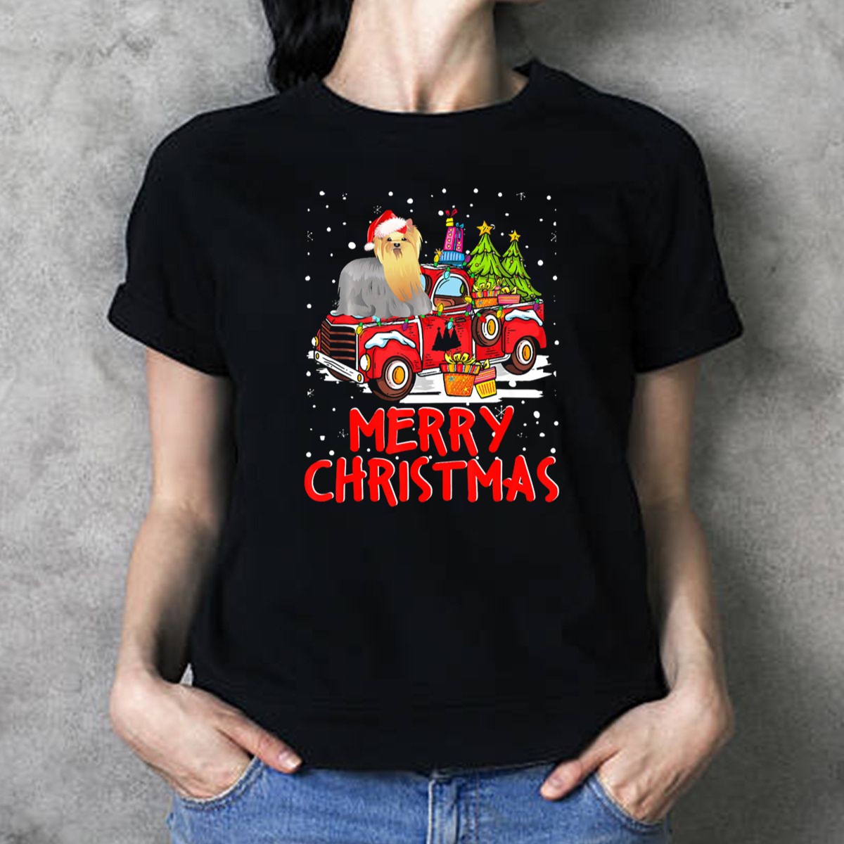 Yorkshire Terrier Rides Red Truck Merry Christmas T Shirt