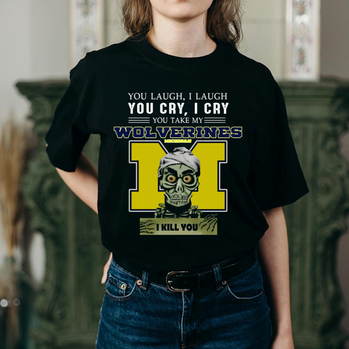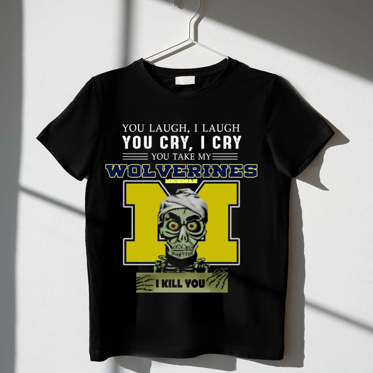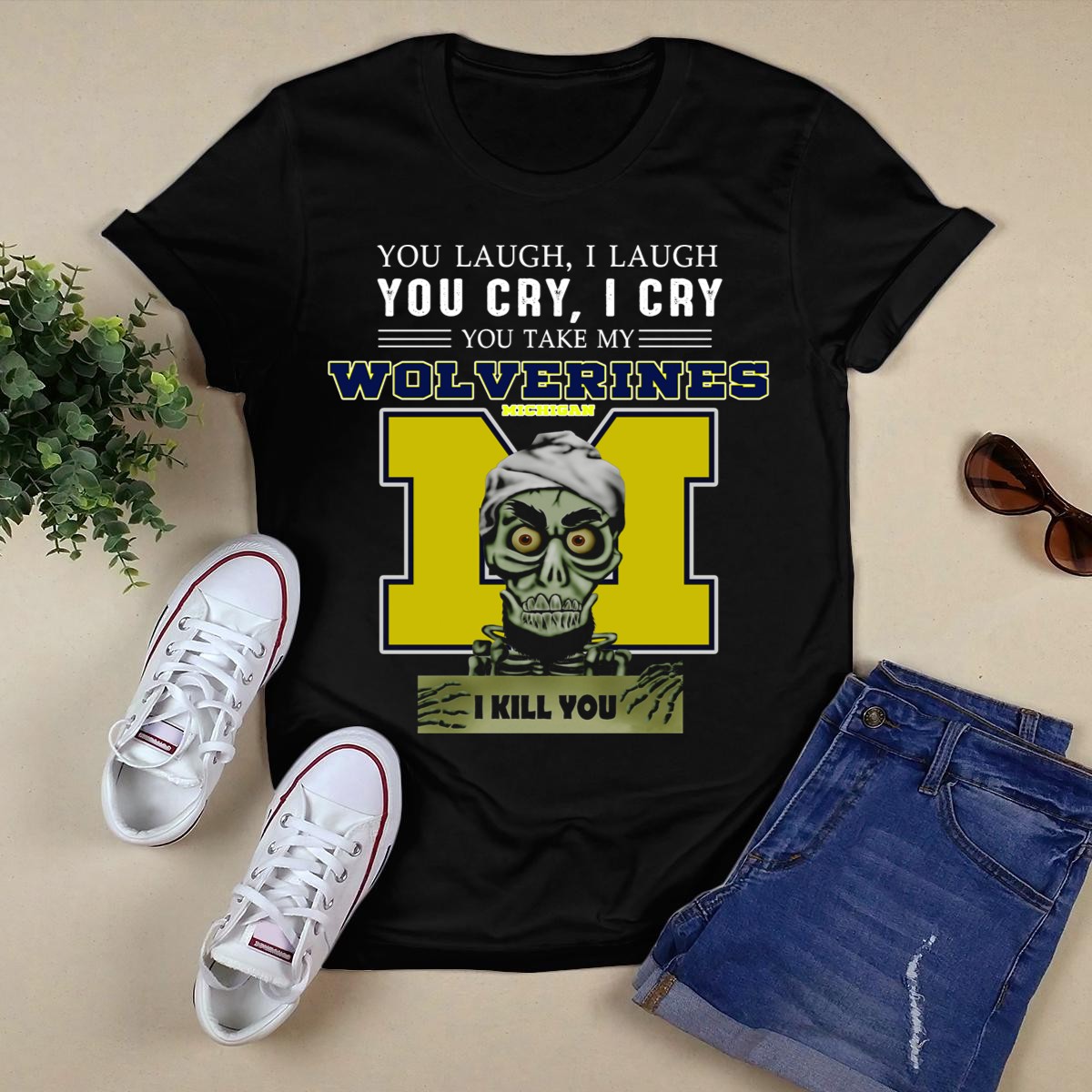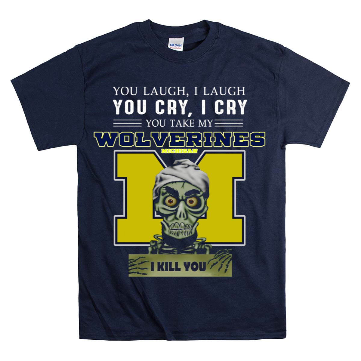 Show off your unwavering support for the Michigan Wolverines with our “You Laugh I Laugh You Cry I Cry You Take My Michigan Wolverines I Kill You” T-shirt. Perfect for die-hard fans, this shirt is ideal for casual outings, game day gatherings, or themed events. Crafted with a fan-made design and printed in the USA, this T-shirt allows you to express your passion while enjoying all-day comfort and style.