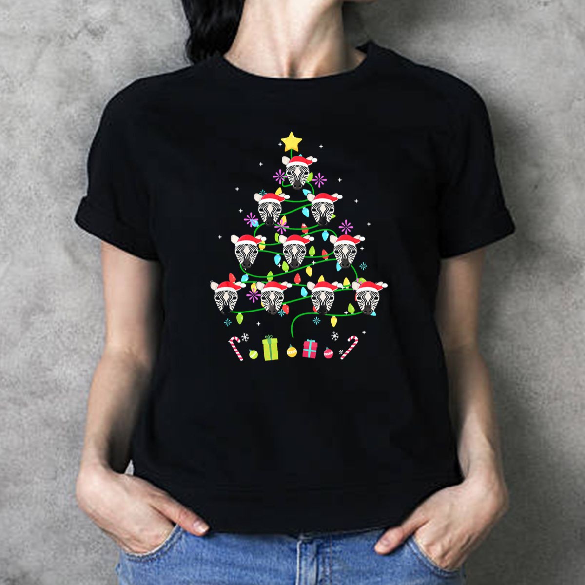 Embrace the holiday spirit with our Zebra Heads Santa Hats Christmas Tree Lights Candy Canes Presents T-Shirt! This fun and festive design is perfect for animal lovers and holiday enthusiasts alike. Ideal for casual gatherings, themed events, or just adding some cheer to your everyday wear, this shirt brings a unique twist to traditional Christmas attire. Made with love and printed in the USA, it’s a delightful addition to your all-season wardrobe.